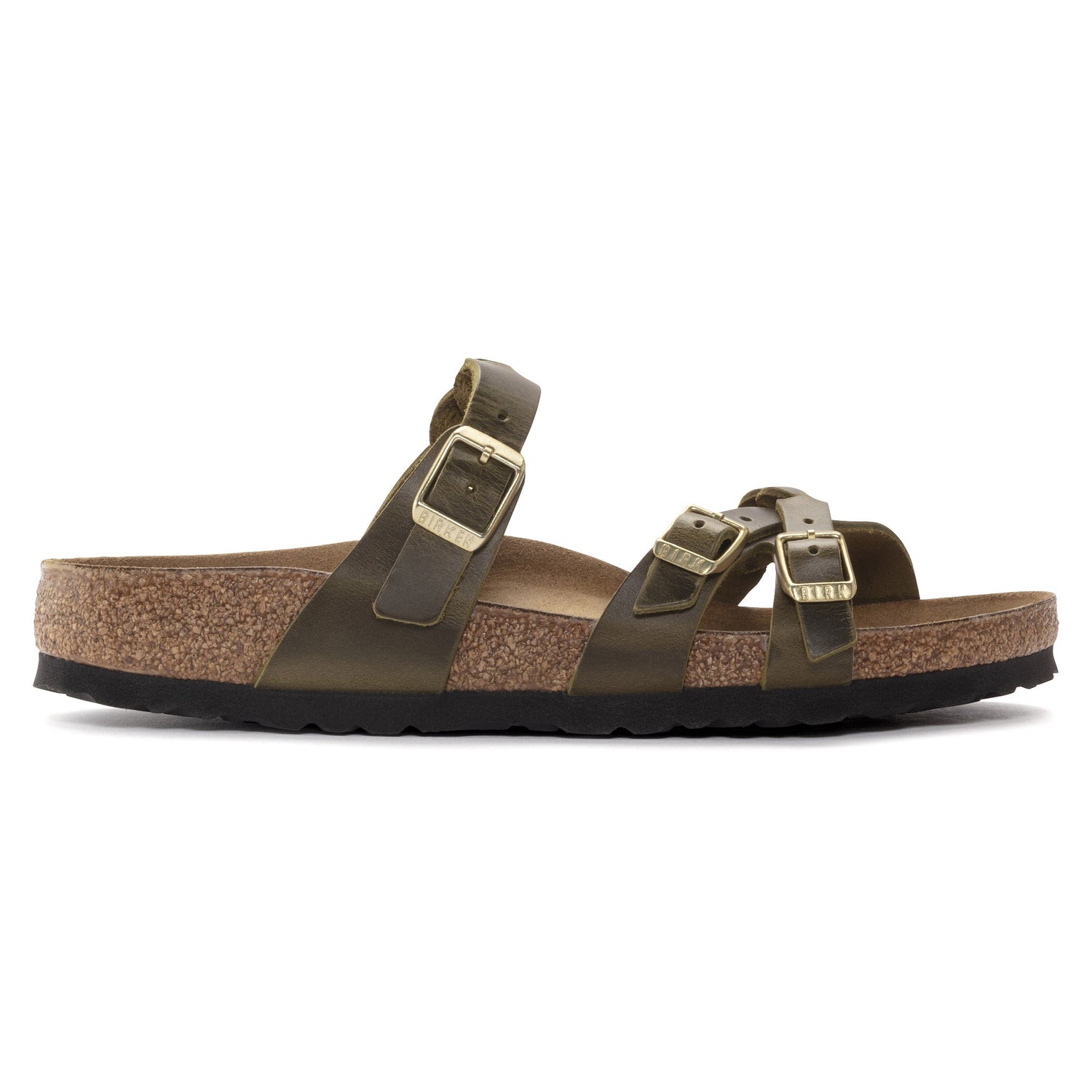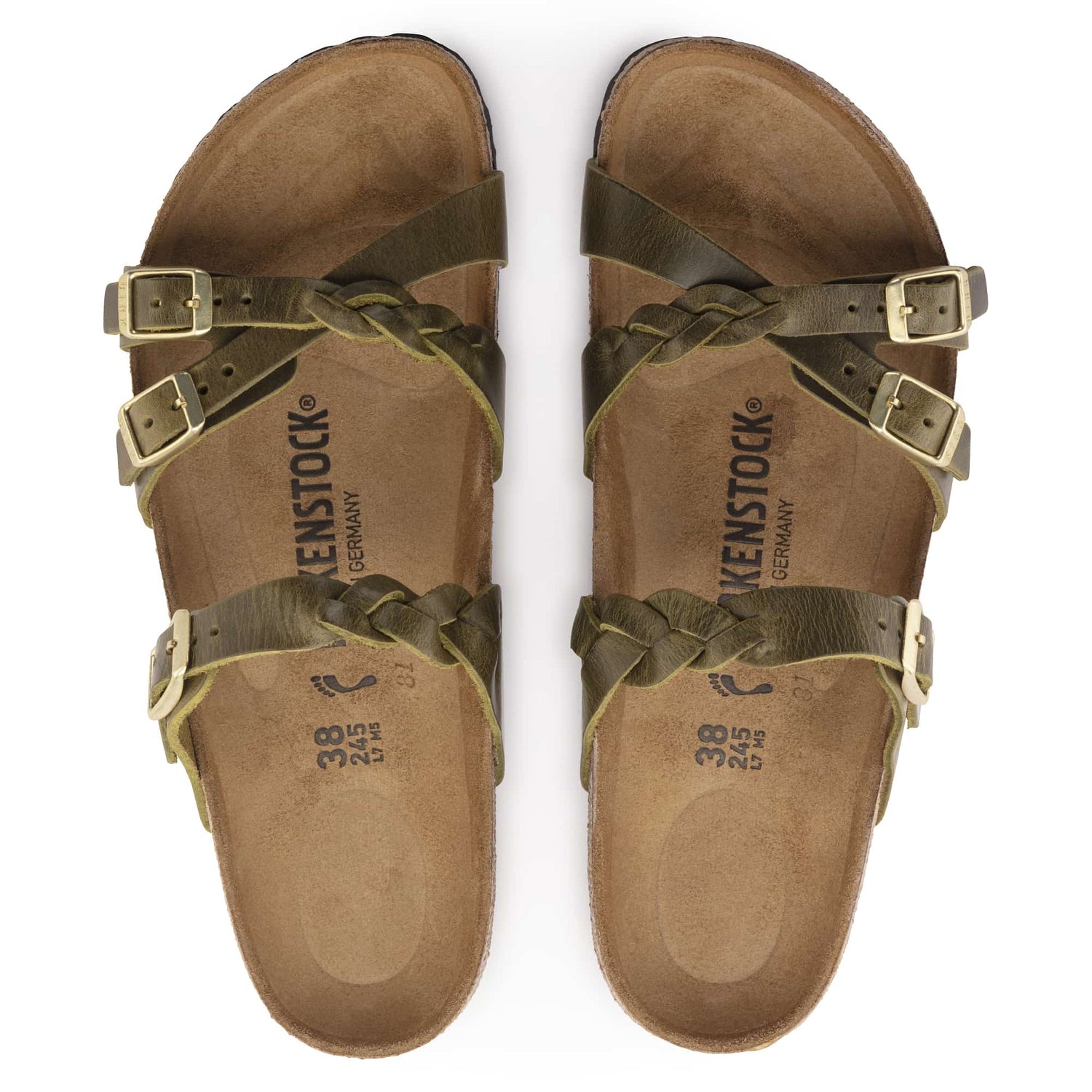 The BIRKENSTOCK Franca is a jaunty sandal with slim cross-over straps. The impressive combination of design and wearability will see fashion-conscious women through the day with elegance and comfort. Here, the model comes with a special detail: the straps have a braided pattern which makes them the perfect match for the fashionable boho styles. The upper is made from extra thick, oiled nubuck leather with an open-selvage finish.