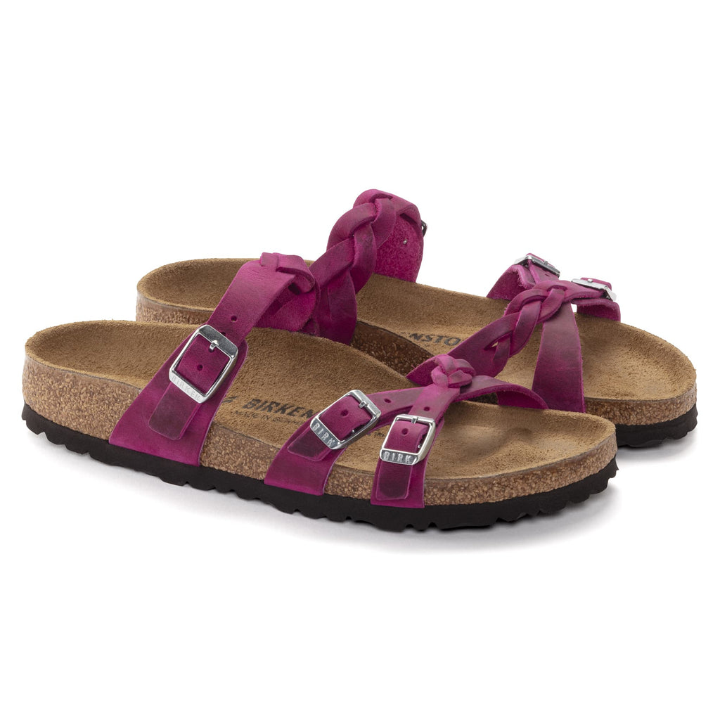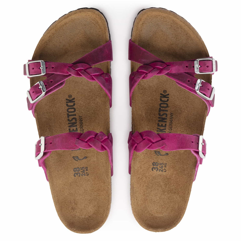 The BIRKENSTOCK Franca is a jaunty sandal with slim cross-over straps. The impressive combination of design and wearability will see fashion-conscious women through the day with elegance and comfort. Here, the model comes with a special detail: the straps have a braided pattern which makes them the perfect match for the fashionable boho styles. The upper is made from extra thick, oiled nubuck leather with an open-selvage finish.