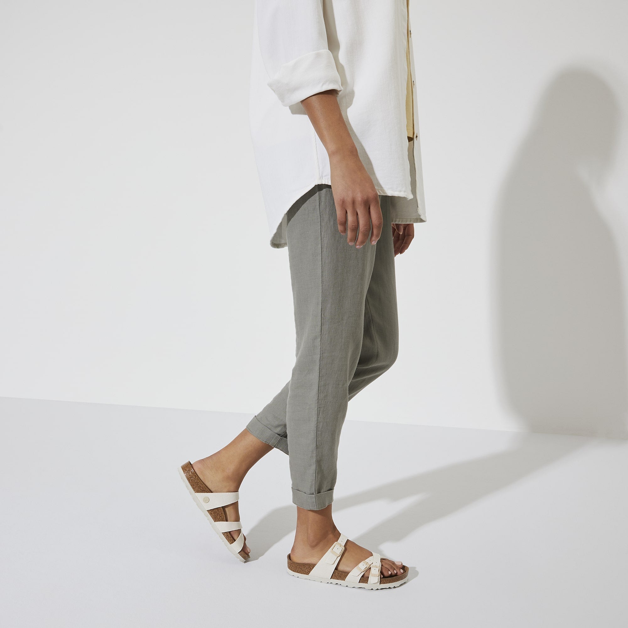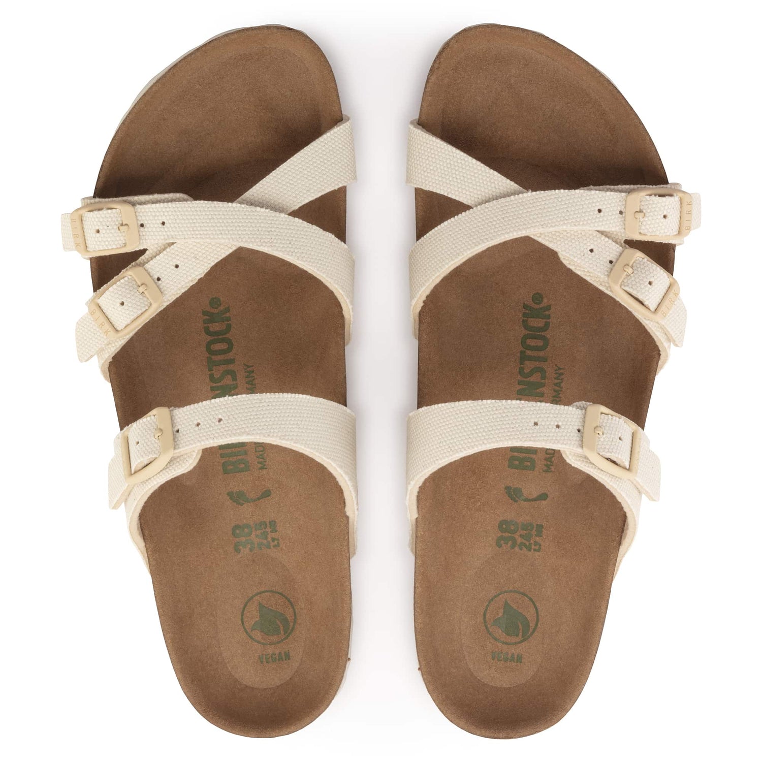 The BIRKENSTOCK Franca is a jaunty sandal with slim cross-over straps. The impressive combination of design and wearability will see fashion-conscious women through the day with elegance and comfort. This popular sandal has been given an update in a new material, with a vegan version now available. It is entirely free of animal products, as verified by independent testing laboratories. The color-coordinated buckles with a textile feel and a matte design as well as the color-coordinated outsole are additional eye-catchers. The upper is made from a soft fabric.