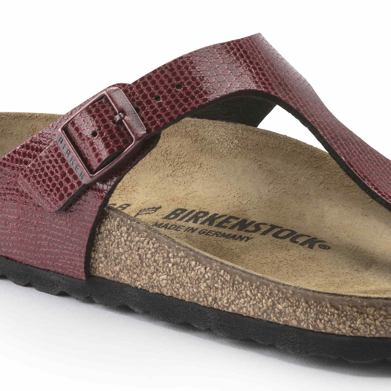 The Gizeh is a modern thong sandal from BIRKENSTOCK. Signature comfort with a refined, minimalist style, featuring the support of the iconic footbed. This version features a glossy, metallic snake pattern effect. The color-coordinated pin buckles round off the shoes look. The upper is made from the skin-friendly, hard-wearing synthetic material Birko-Flor®.