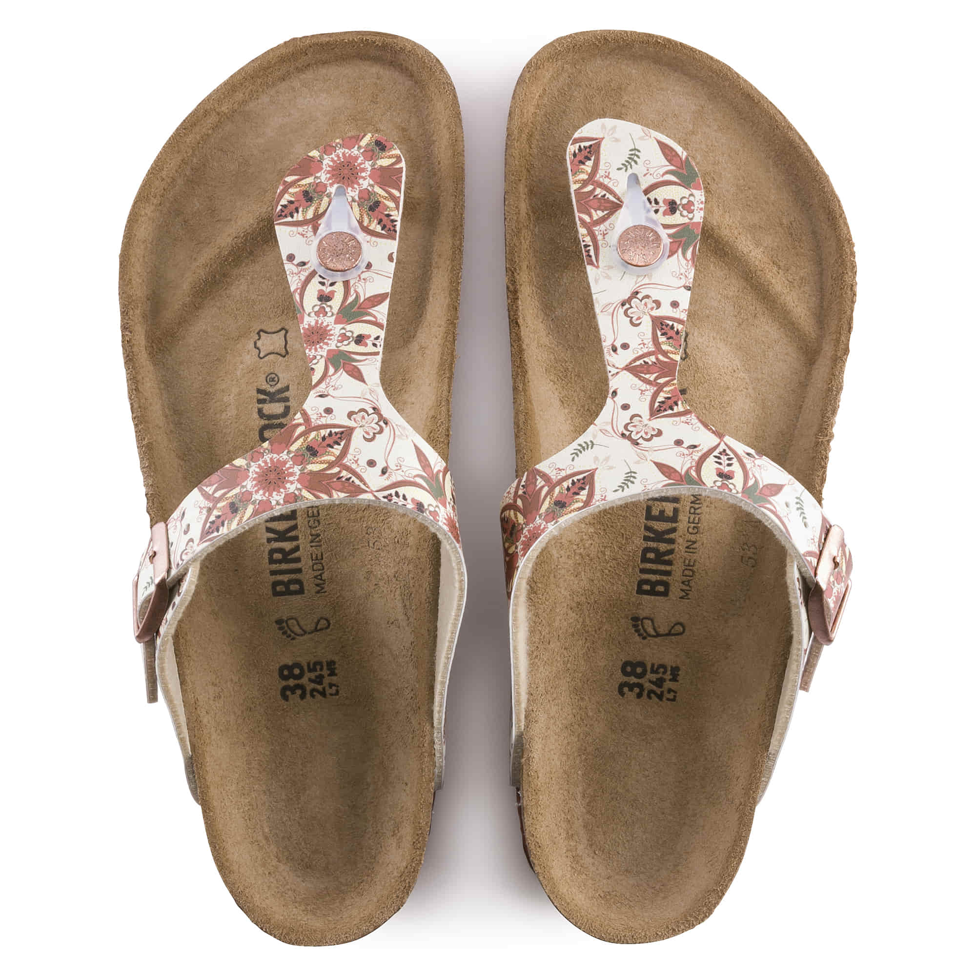 The BIRKENSTOCK Gizeh is a genuine classic that combines optimum grip with minimalist, fashionable design. This model is presented in a colorful Bohemian style with a floral pattern that makes it extra eye-catching. The color-coordinated outsole and the buckles round off the shoe look of sophistication. The upper is made from the skin-friendly, hard-wearing synthetic material Birko-Flor®.