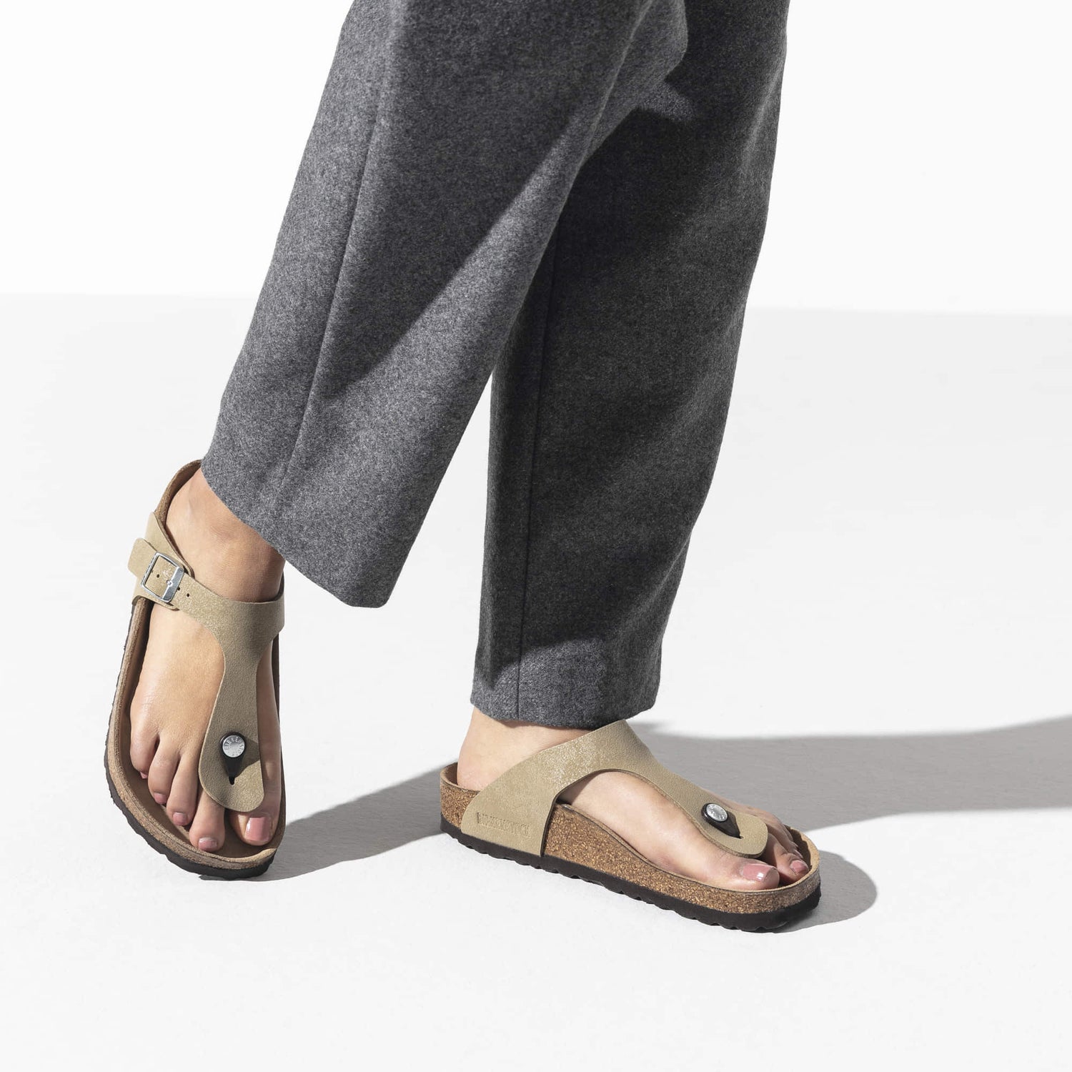 The BIRKENSTOCK Gizeh is a genuine classic that combines optimum grip with minimalist, fashionable design. Here, the sophisticated interplay of material of gives the classic model a new look. Thanks to the brushed Birko-Flor®, the vegan version can easily be mistaken for genuine leather. It is entirely free of animal products, as verified by independent testing laboratories.