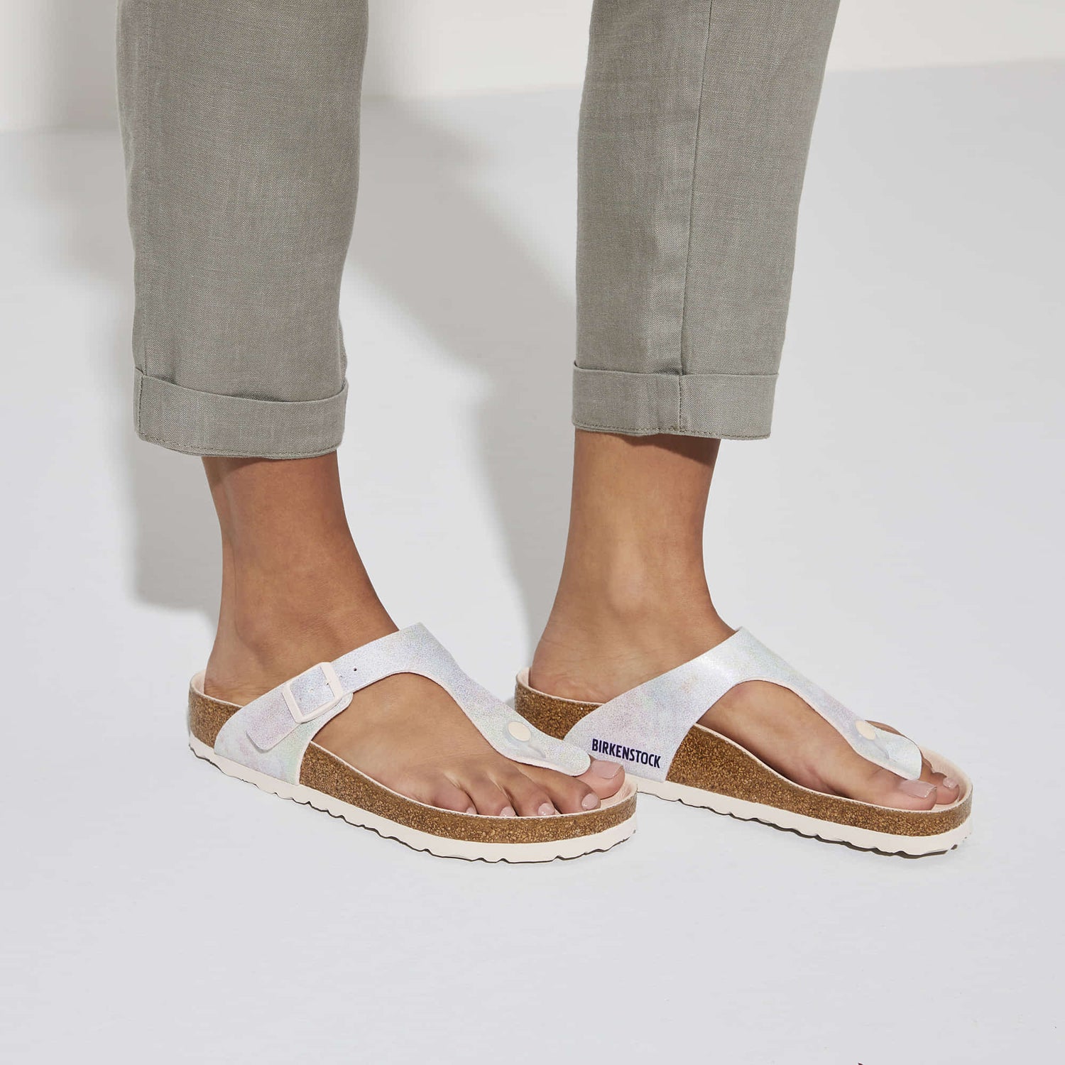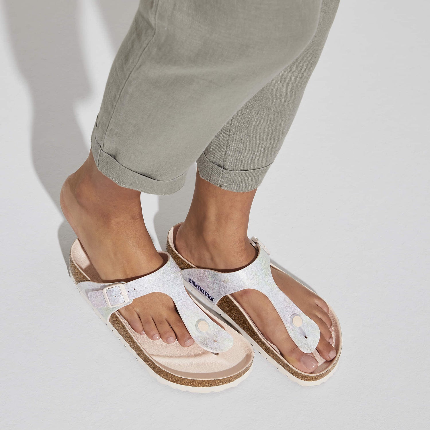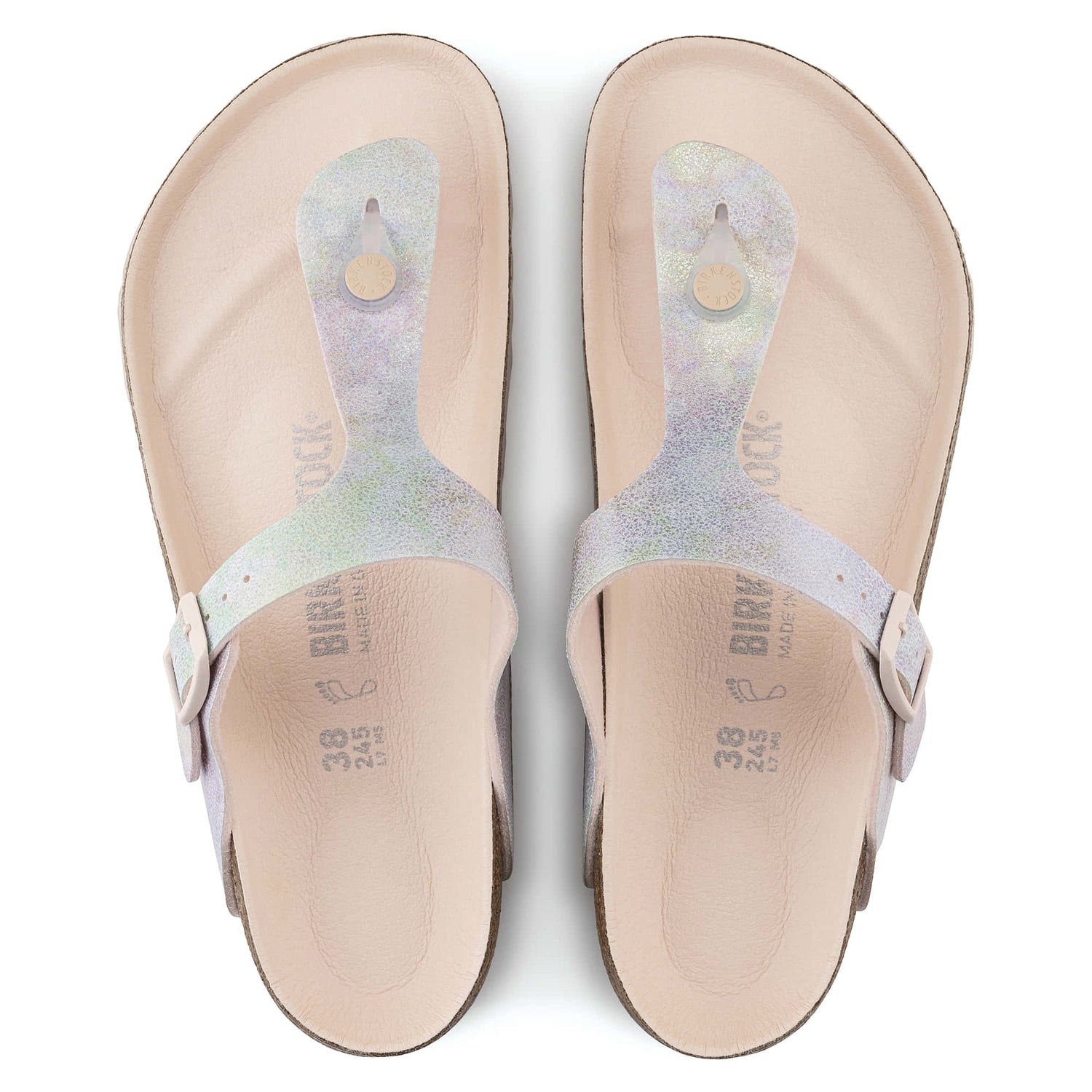 The BIRKENSTOCK Gizeh is a genuine classic that combines optimum grip with minimalist, fashionable design. This version features an iridescent, silky sheen and sparkles in all colors of the rainbow. The color-coordinated details and buckles with a textile feel and a matte design round off the shoes look of sophistication. The upper is made from skin-friendly microfiber.