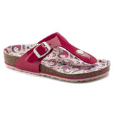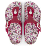 The BIRKENSTOCK Gizeh Kids BS Birko-Flor Patent Fuchsia Tulip &Unicorn Sandal is a genuine classic that combines optimum grip with fashionable design to really turn heads at school. This version of the sandal will set girls' hearts racing. The colorful unicorn print on the footbed will put a smile on kids' faces all summer long. The color-coordinated pin buckles round off the shoe's look of sophistication. The colorful two-layer sandwich sole additionally catches the eye. The upper is made from the skin-friendly, hard-wearing synthetic material Birko-Flor with a shiny patent coating.