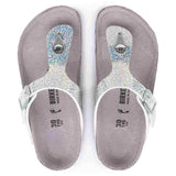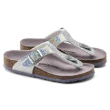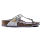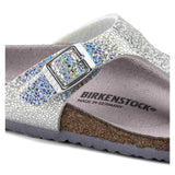 The BIRKENSTOCK Gizeh Kids BS Micro Fibre Disco Ball Silver & Lavender Sandal is a genuine classic that combines optimum grip with fashionable design to really turn heads at school. This version comes in a glittering disco design and will make girl's hearts beat faster. The color-coordinated footbed and outsole round off the shoe's look of sophistication. The upper is made from skin-friendly microfiber.