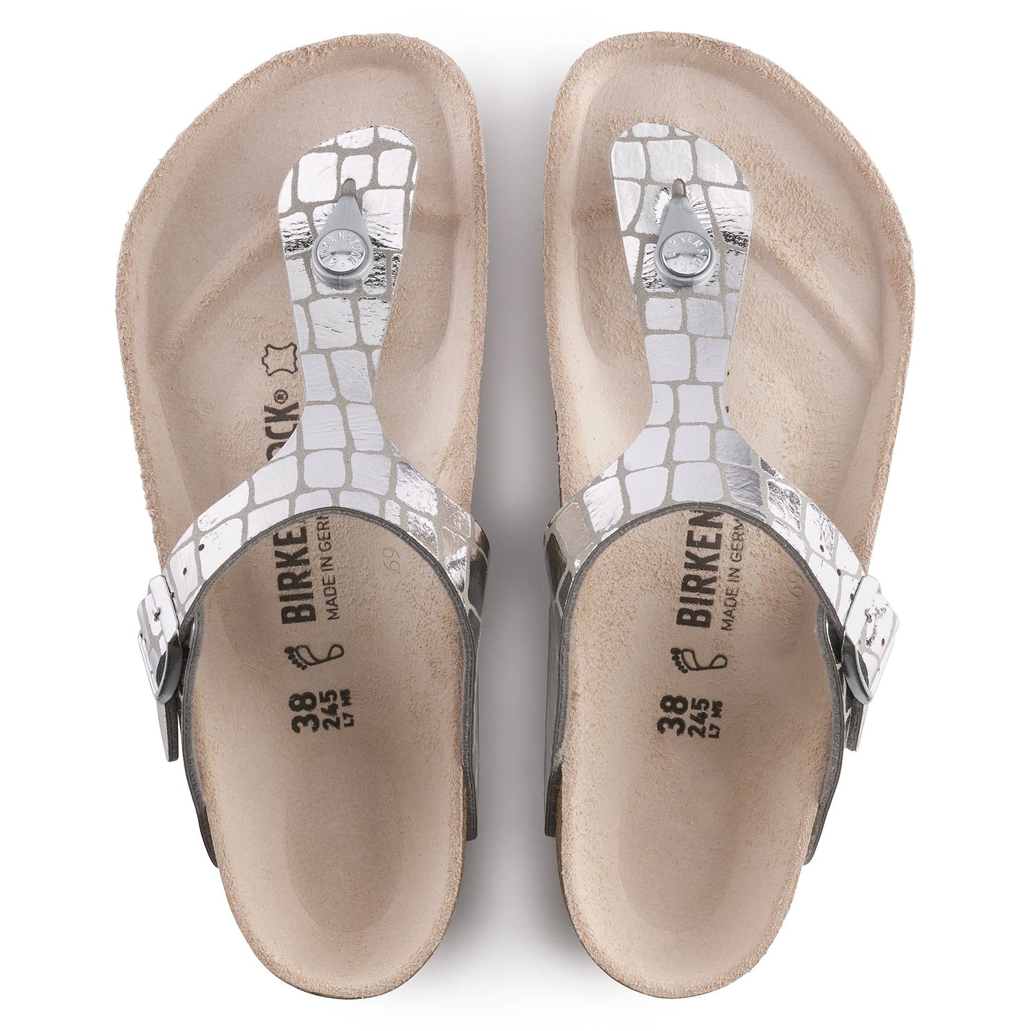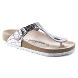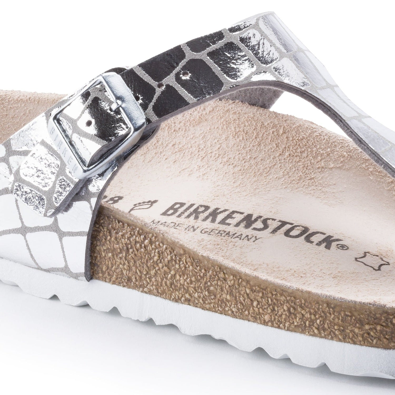 The BIRKENSTOCK Gizeh Micro Fibre Pink and Silver sandals a genuine classic that combines optimum grip with minimalist, fashionable design. This version sports an alligator pattern and an eye-catching microfiber material made with a matte base combined with a shiny-effect film. Inspired by nature, no two shoes have the same look and feel. The color-coordinated footbed rounds off the shoe look of sophistication. The upper is made from skin-friendly microfiber.