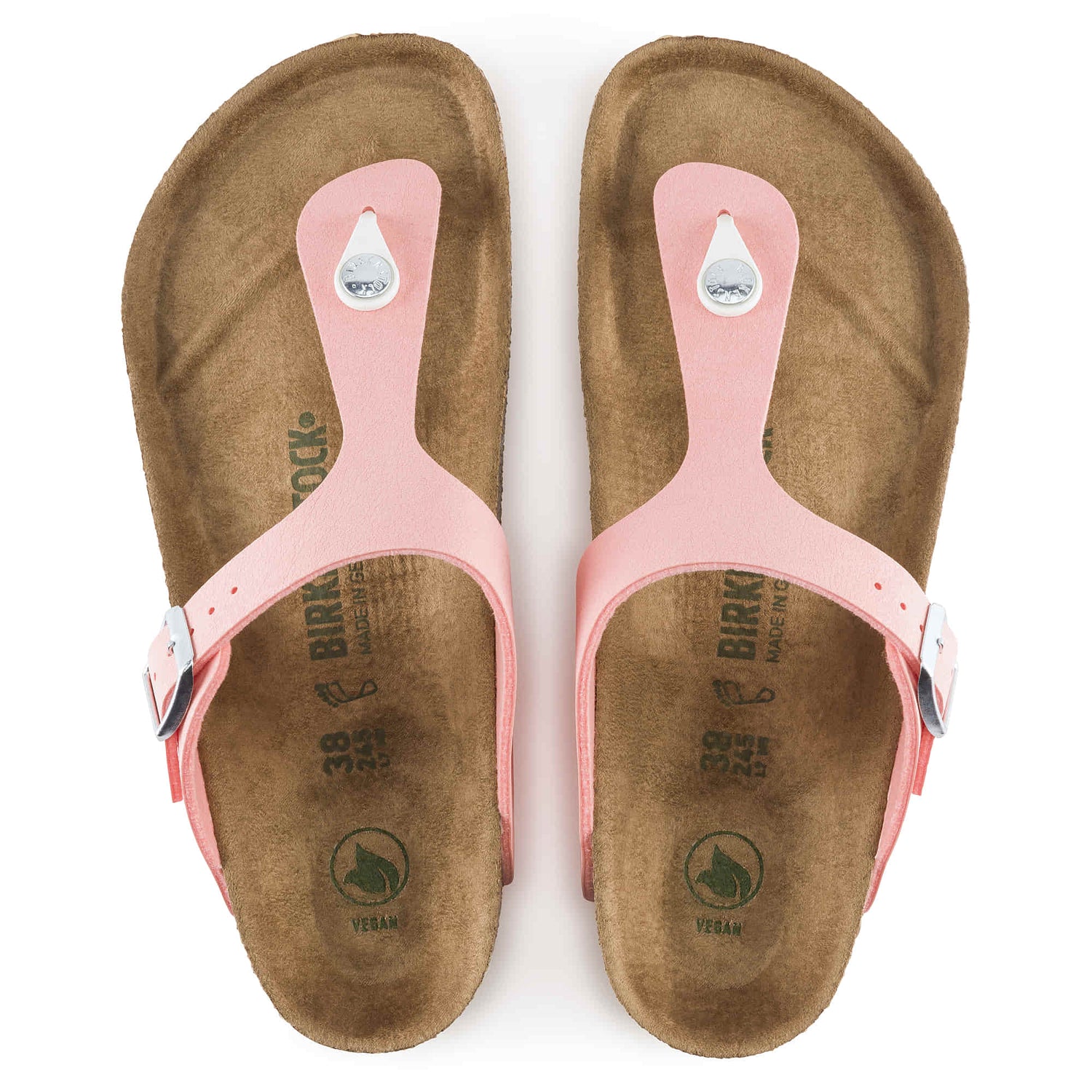 The BIRKENSTOCK Gizeh is a genuine classic that combines optimum grip with minimalist, fashionable design. This popular sandal has been given an update in a new material, with a vegan version now available. It is entirely free of animal products, as verified by independent testing laboratories. The color-coordinated outsole rounds off the shoe look of sophistication. The upper is made from the skin-friendly, hard-wearing synthetic material Birko-Flor®.