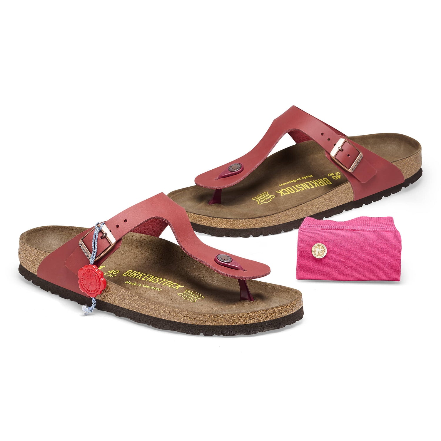 • Details: thong with an individually adjustable metal pin buckle in the original design; free pair of socks