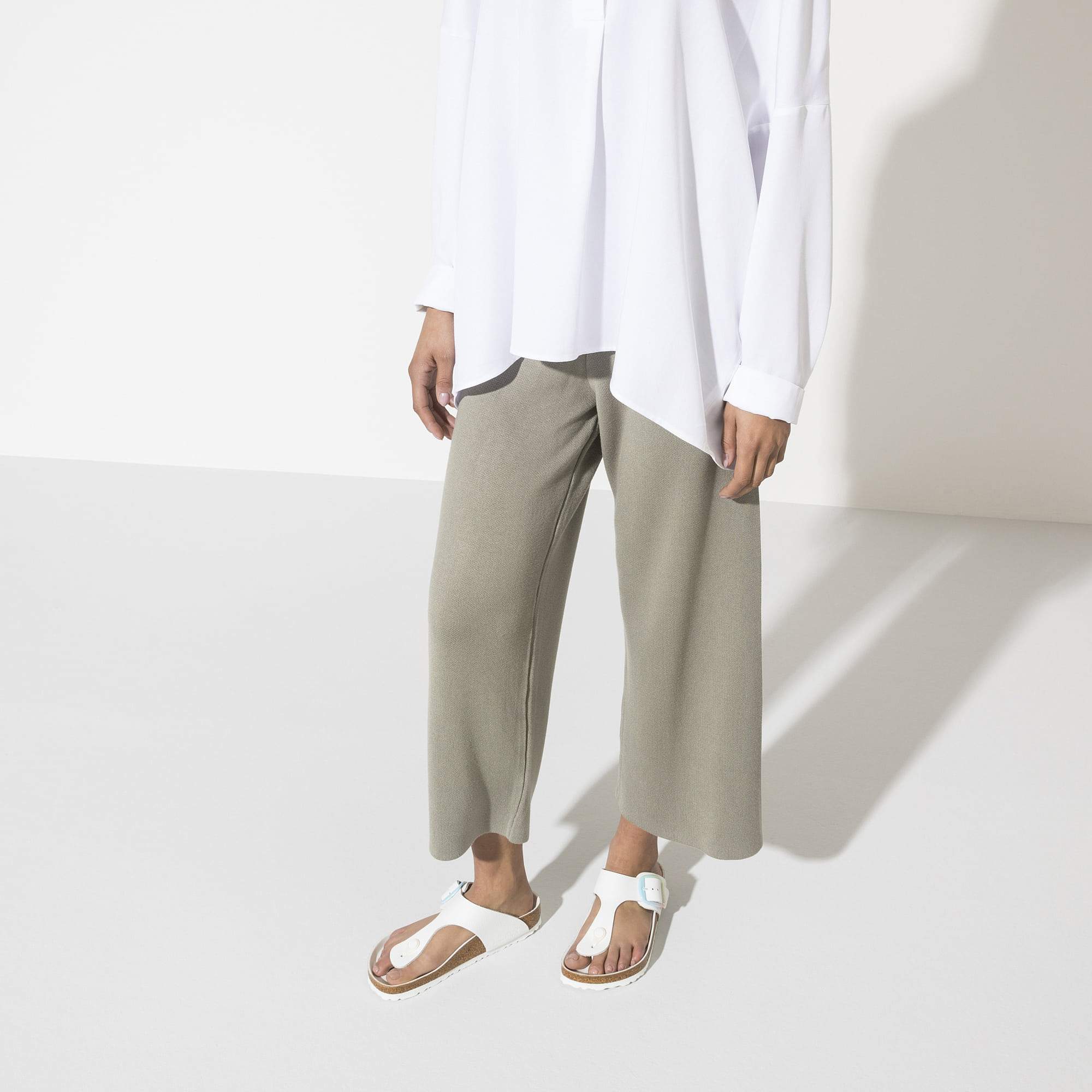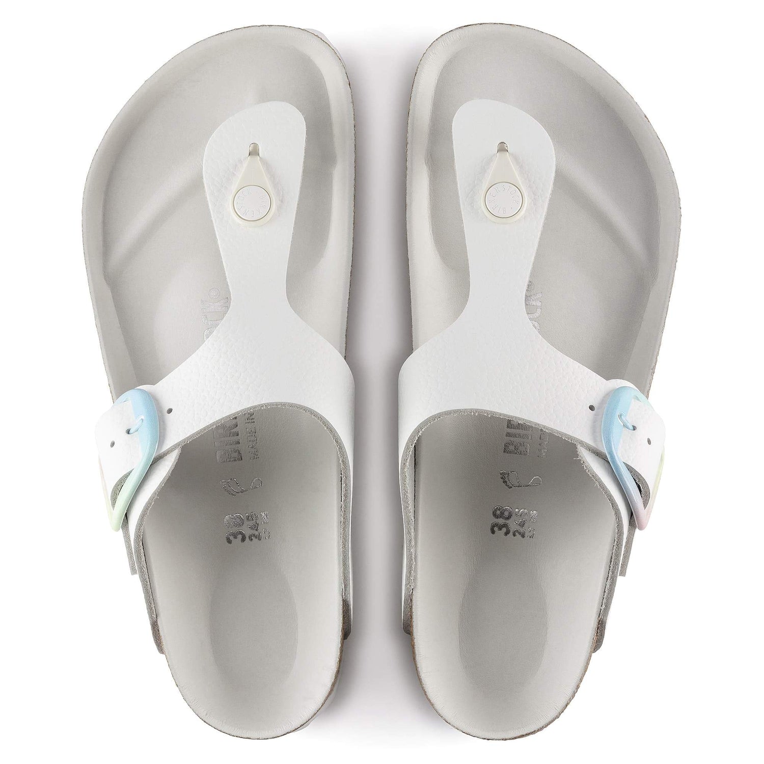 The BIRKENSTOCK Gizeh is a genuine classic that combines optimum grip with minimalist, fashionable design. This version features our popular Big Buckle with a rainbow effect a fantastic, striking eye-catcher on this otherwise understated sandal. The color-coordinated semi-exquisite footbed is fully lined with soft piumato leather, making it exceptionally comfortable. The upper is made from high-quality aniline leather.