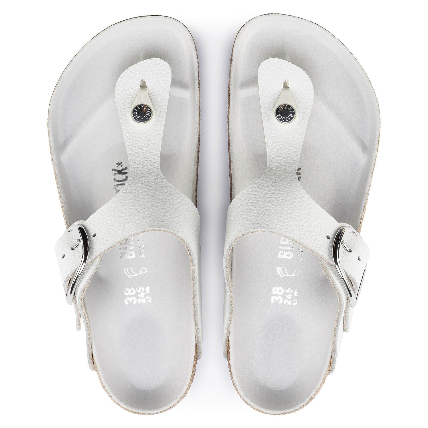 The BIRKENSTOCK Gizeh is a genuine classic that combines optimum grip with minimalist, fashionable design. The Big Buckle version features a large, elegant pin buckle a fantastic, striking eye-catcher on this otherwise understated sandal. The semi-exquisite footbed is fully lined with soft piumato leather, making it exceptionally comfortable. The upper is made from high-quality, soft natural leather.