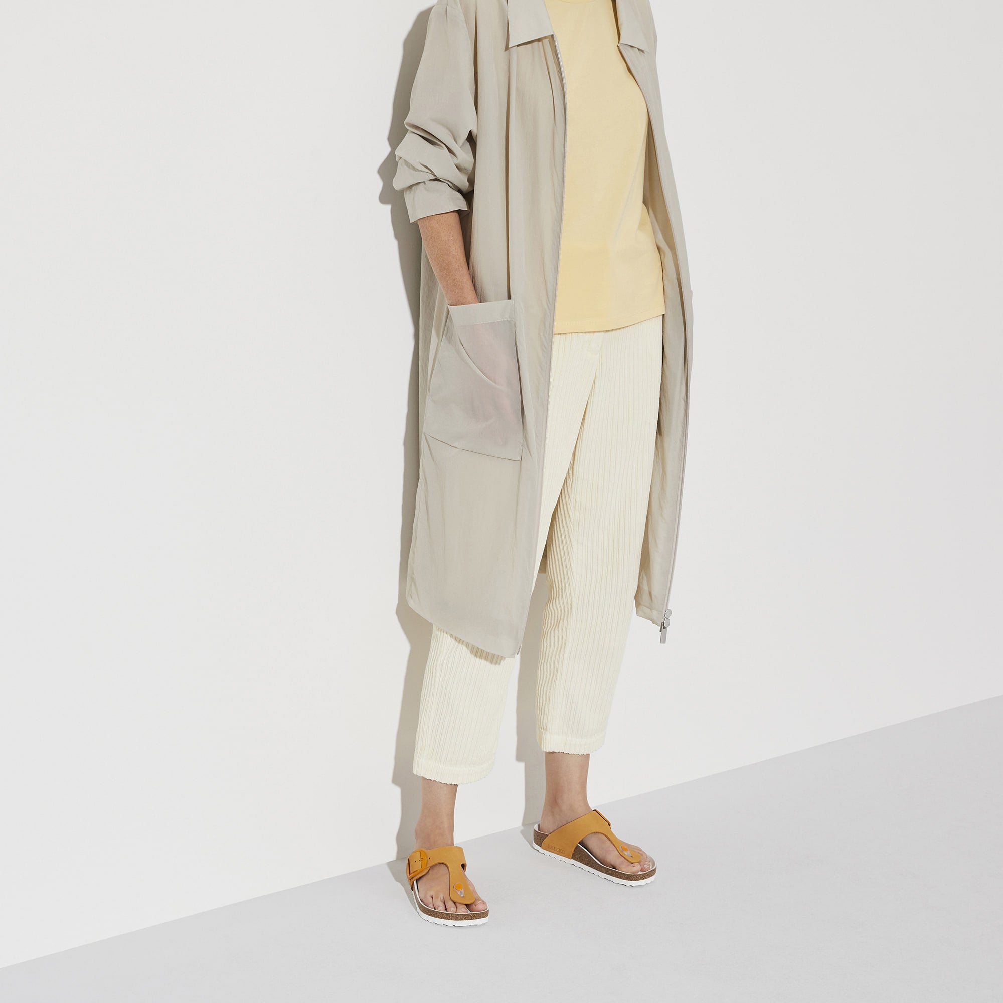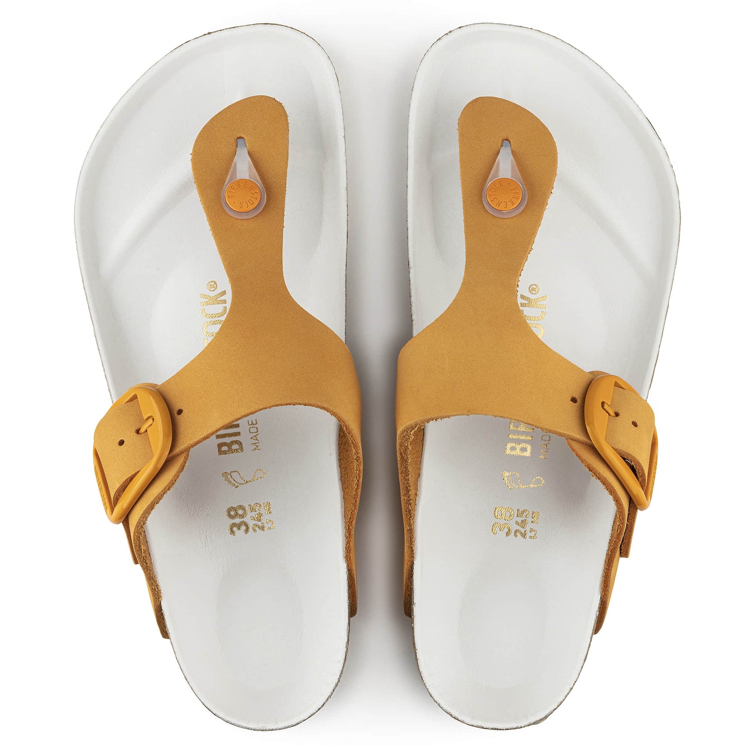 The BIRKENSTOCK Gizeh is a genuine classic that combines optimum grip with minimalist, fashionable design. The Big Buckle version features a large, elegant pin buckle'a fantastic, striking eye-catcher on this otherwise understated sandal. The color-coordinated details round off the shoe's look. The semi-exquisite footbed is fully lined with soft piumato leather, making it exceptionally comfortable. The upper is made from high-quality nubuck leather that boasts a natural, rustic appearance.