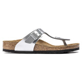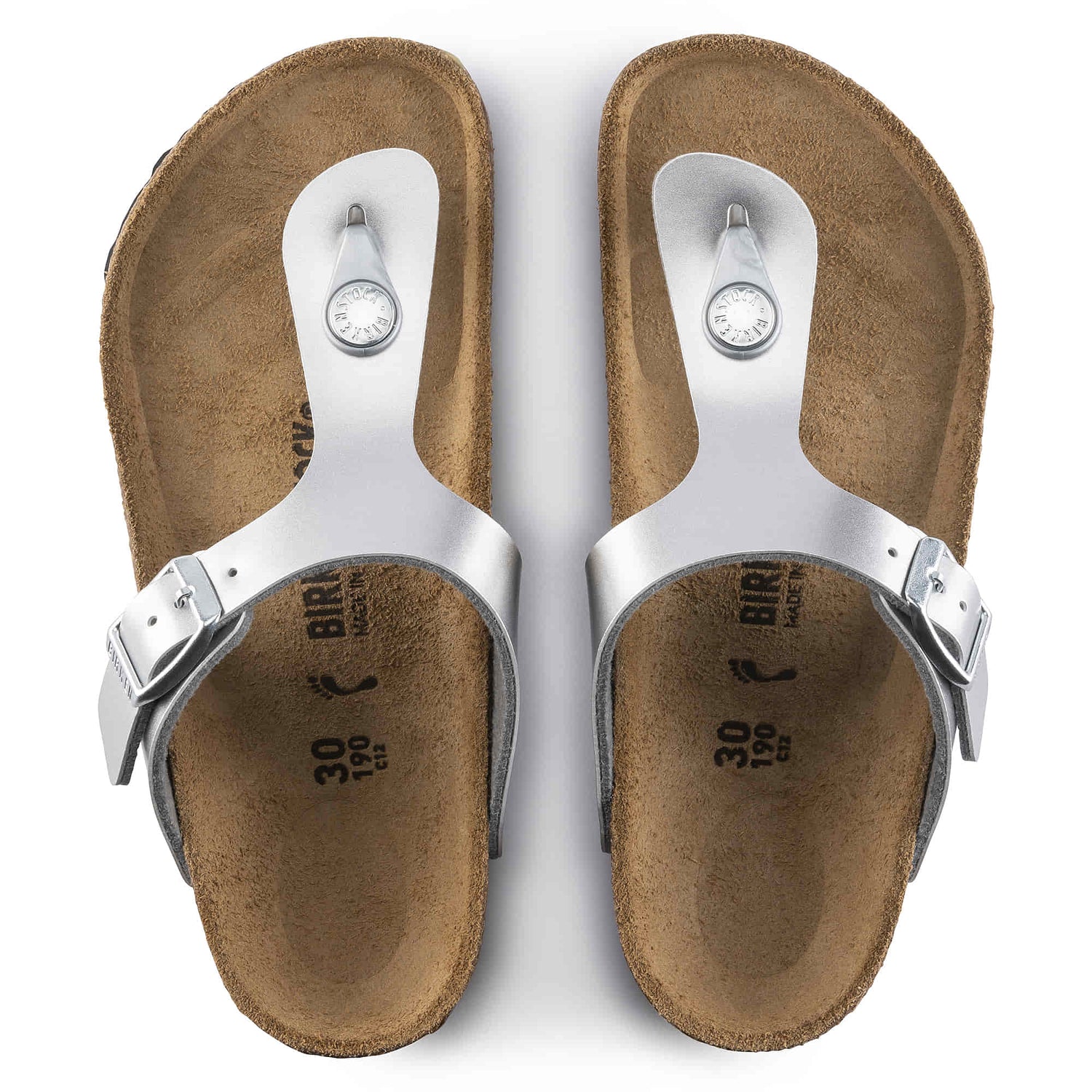 The BIRKENSTOCK Gizeh is a genuine classic that combines optimum grip with fashionable design to really turn heads at school. This sandal was reinterpreted in an extravagant electric metallic look. The reflective film makes this classic model dazzle and is sure to make any outfit turn heads. The color-coordinated outsole and the buckles round off the shoes look of sophistication. The upper is made from the skin-friendly, hard-wearing synthetic material Birko-Flor®.