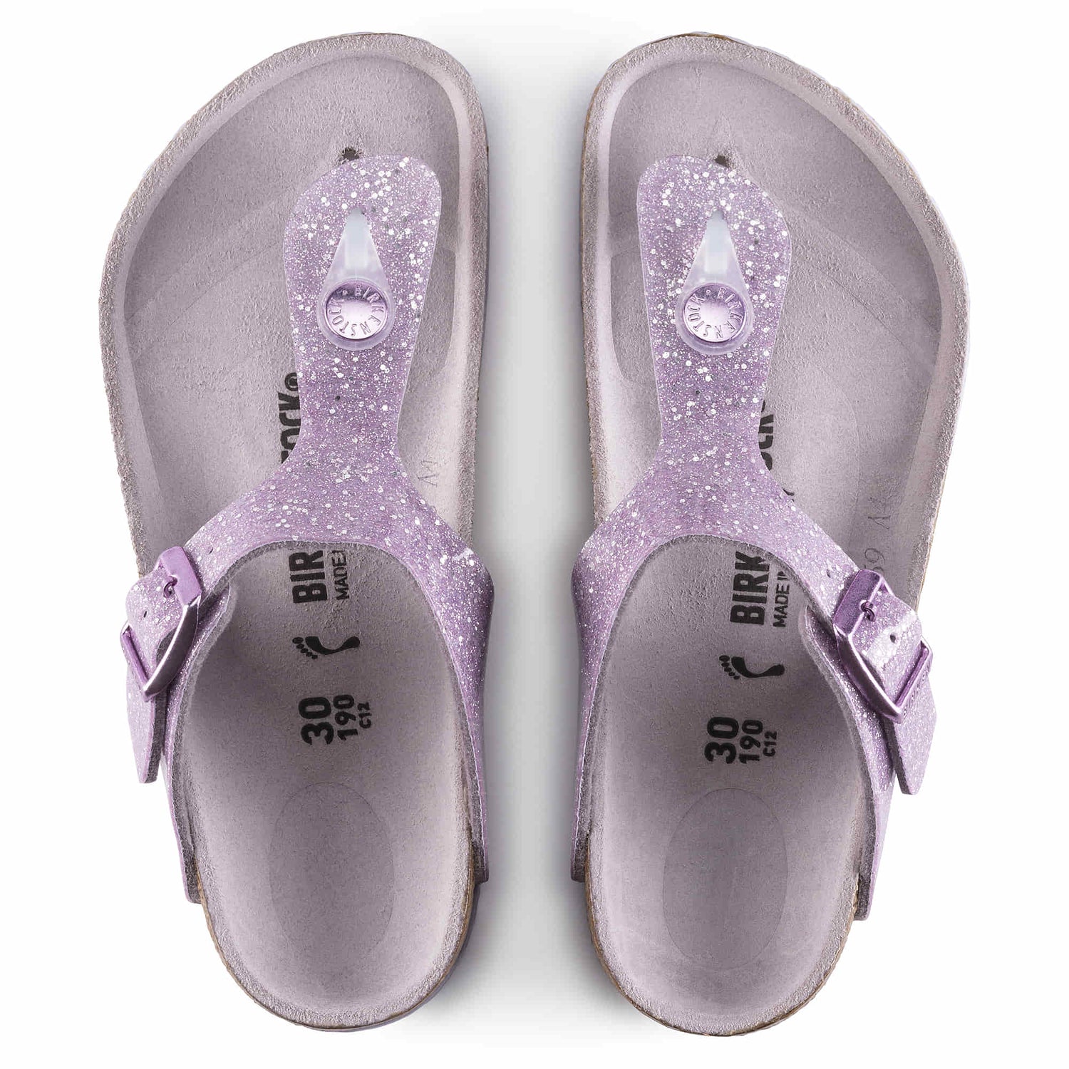 The BIRKENSTOCK Gizeh is a genuine classic that combines optimum grip with fashionable design to really turn heads at school. The Cosmic Sparkle version features a striking glitter effect and a shiny coating, making the sandal sparkle and setting girls hearts racing. The color-coordinated outsole rounds off the shoes look of sophistication. The upper is made from the skin-friendly, hard-wearing synthetic material Birko-Flor®.