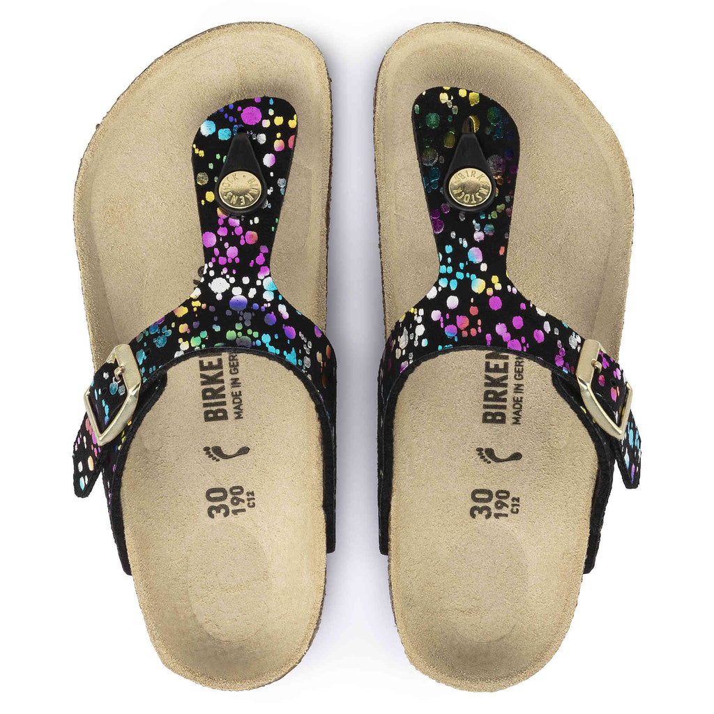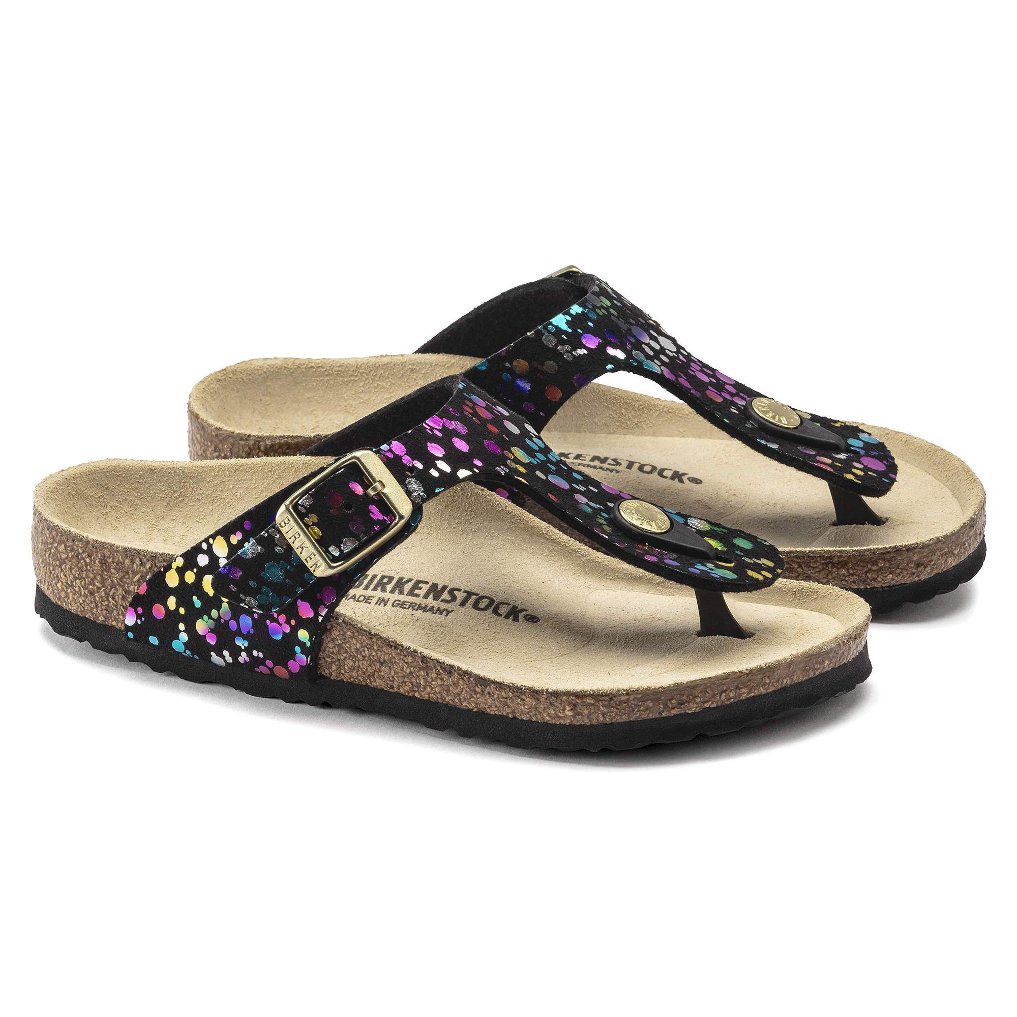 The BIRKENSTOCK Gizeh Kids BS Micro Fibre Confetti Black Sandal is a genuine classic that combines optimum grip with fashionable design to really turn heads at school. This version comes in a creatively vibrant play of colors that brings confetti to mind. A special film coating creates a quality glitter effect. The upper is made from skin-friendly microfiber.