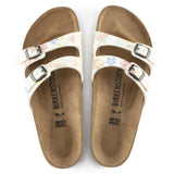 The BIRKENSTOCK Ibiza Birko-Flor White sandaltands out due to its svelte look. With its two narrow straps, the sandal radiates a hint of minimalism and is a delight for anyone who appreciates simple design. This version features a colorful, floral pattern. The creative production process means that no two pairs are the same just like the flowers in a meadow. The upper is made from skin-friendly, hard-wearing Birko-Flor®.