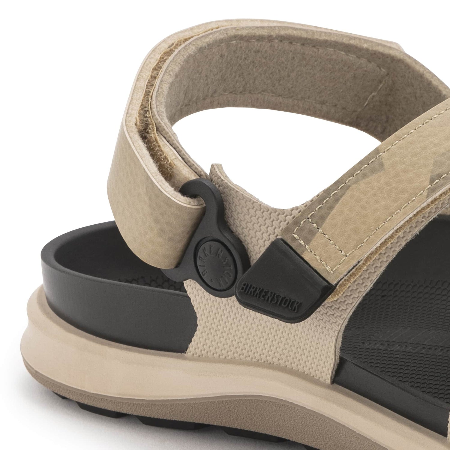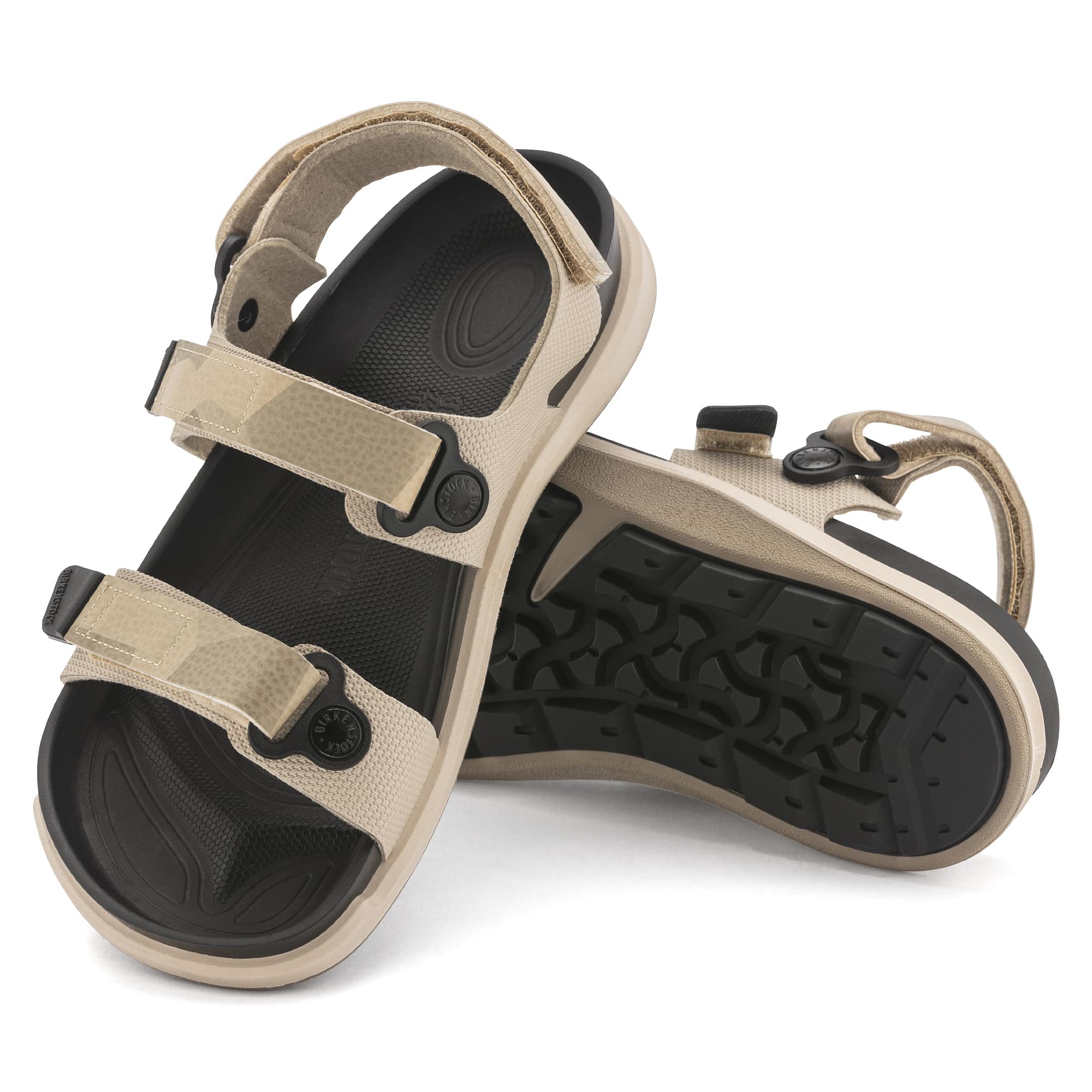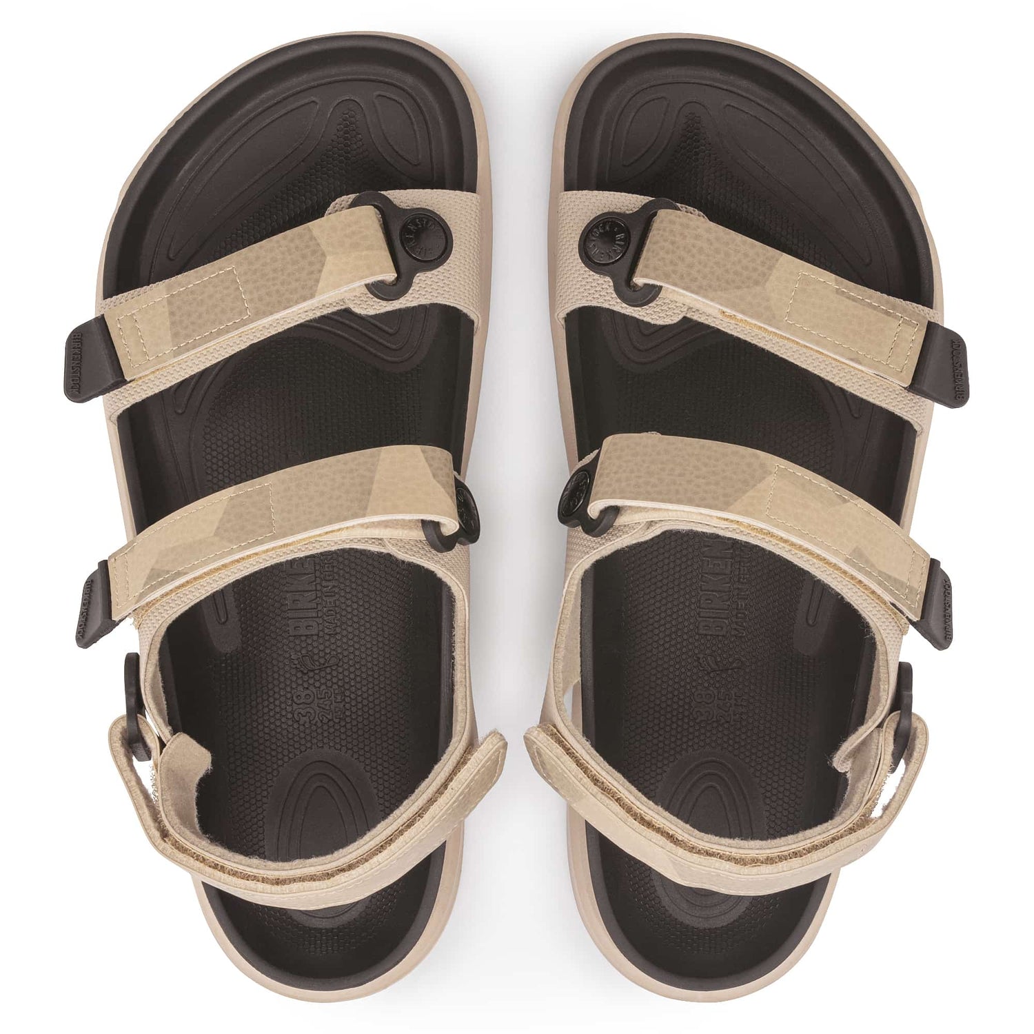 The BIRKENSTOCK Kalahari is a variation of the classic Milano and is the perfect sandal for anyone who is on their feet all day. The pin buckles have been replaced by hook-and-loop fasteners and the heel of the sole has been reinforced. The Kalahari boasts a high level of comfort and great functionality. This version is designed for BIRKENSTOCK fans who are active and looking for an experience. The color-coordinated footbed rounds off the shoe's look of sophistication. The non-slip and abrasion-resistant sole promotes a firm footing. The upper is made from the skin-friendly, hard-wearing synthetic material Birko-Flor® which was reinterpreted with a futuristic look.