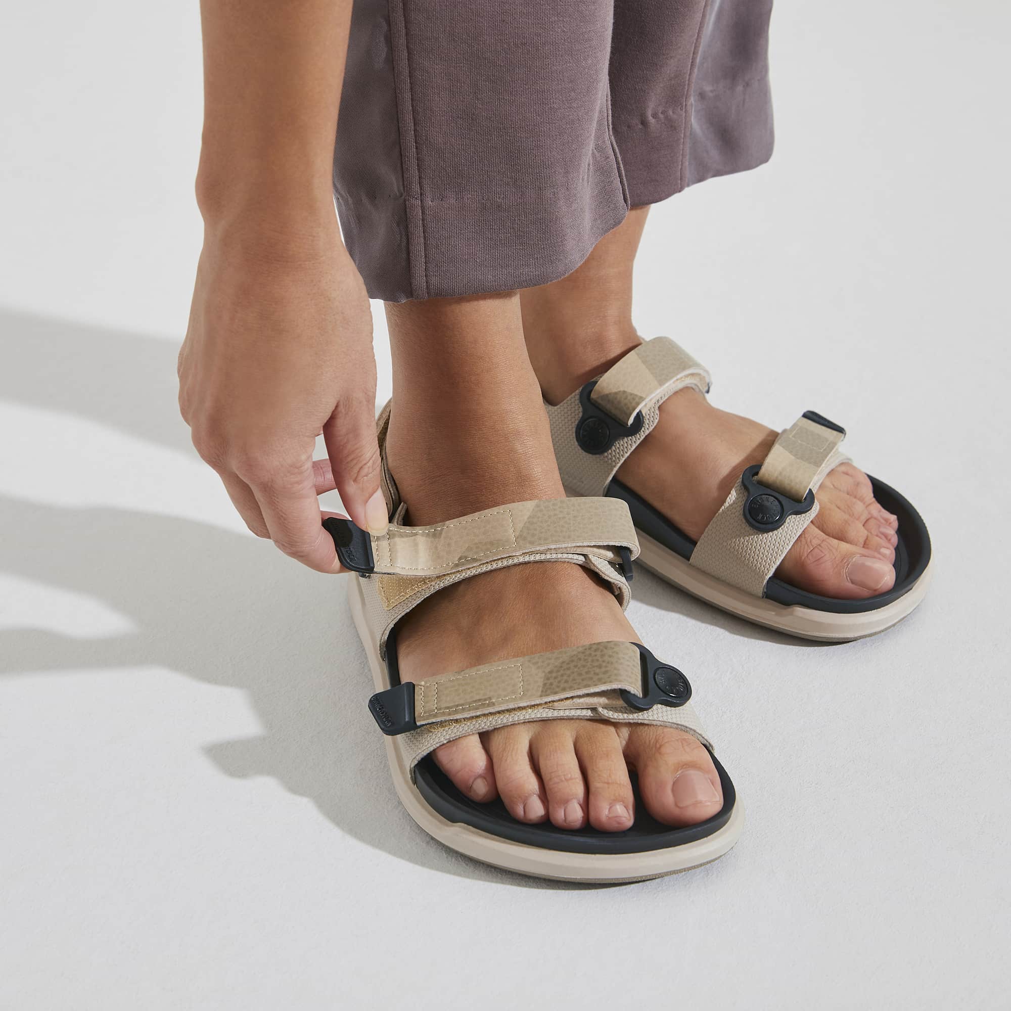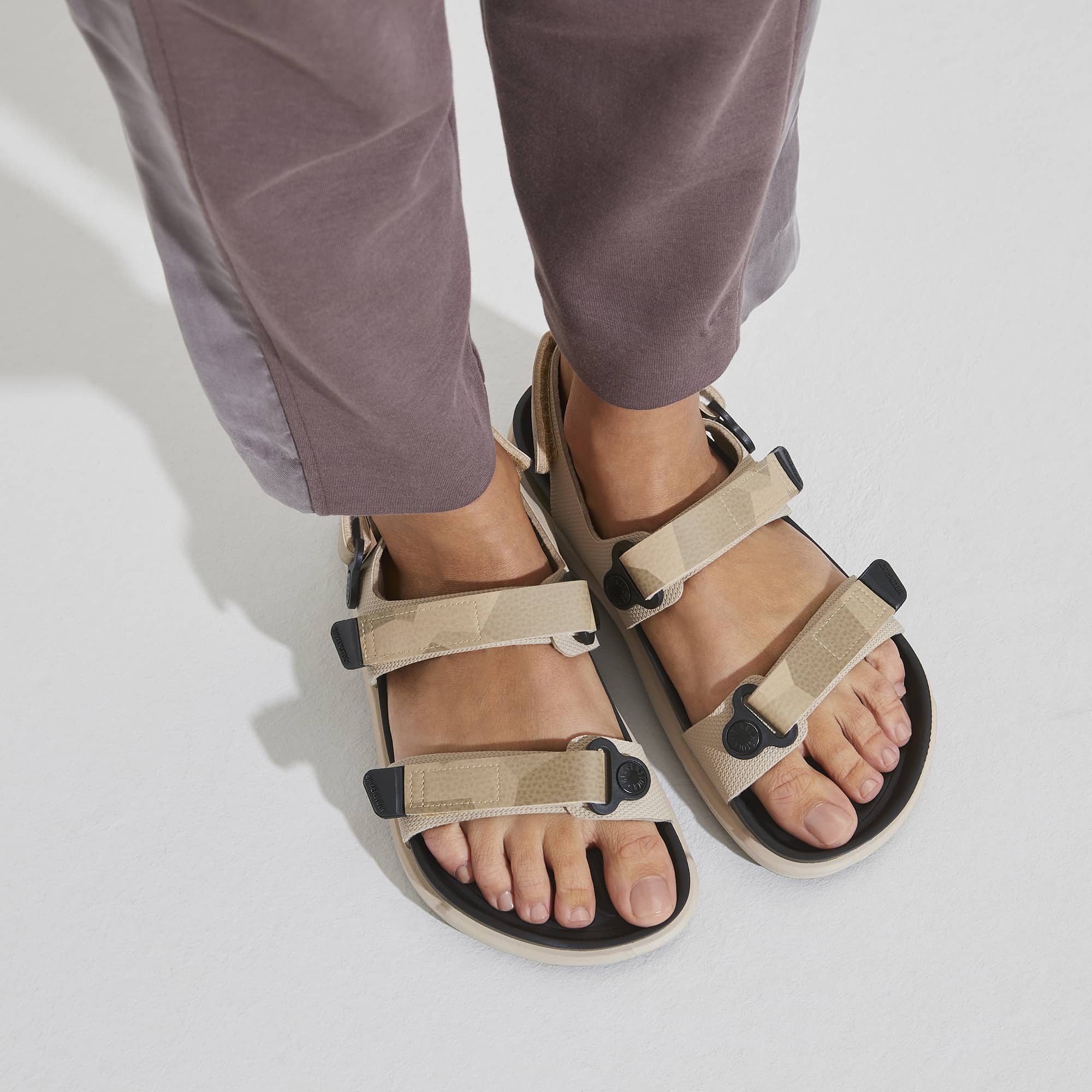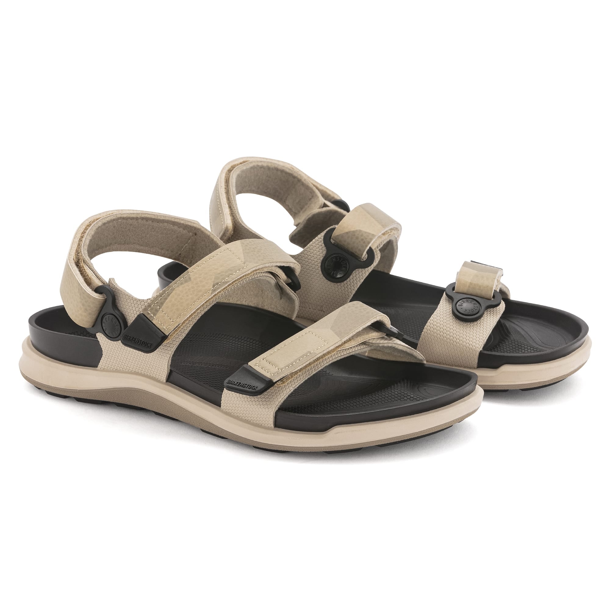 The BIRKENSTOCK Kalahari is a variation of the classic Milano and is the perfect sandal for anyone who is on their feet all day. The pin buckles have been replaced by hook-and-loop fasteners and the heel of the sole has been reinforced. The Kalahari boasts a high level of comfort and great functionality. This version is designed for BIRKENSTOCK fans who are active and looking for an experience. The color-coordinated footbed rounds off the shoe's look of sophistication. The non-slip and abrasion-resistant sole promotes a firm footing. The upper is made from the skin-friendly, hard-wearing synthetic material Birko-Flor® which was reinterpreted with a futuristic look.