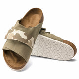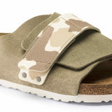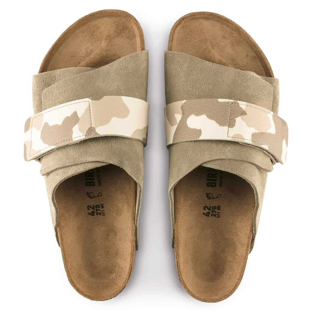 The casual BIRKENSTOCK Kyoto Suede Leather Blue and Brown sandal takes its inspiration from the classic Zurich model and stands out with its compact design and individually adjustable buckle. This offers optimum grip and is complemented by two decorative rivets. This version boasts a subtle camouflage look. The mix of soft suede and printed Birko-Flor® makes for another eye-catcher.
