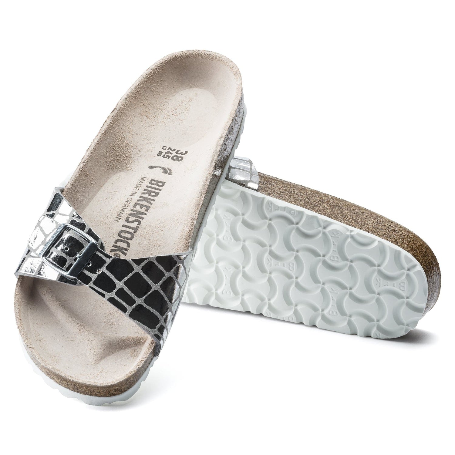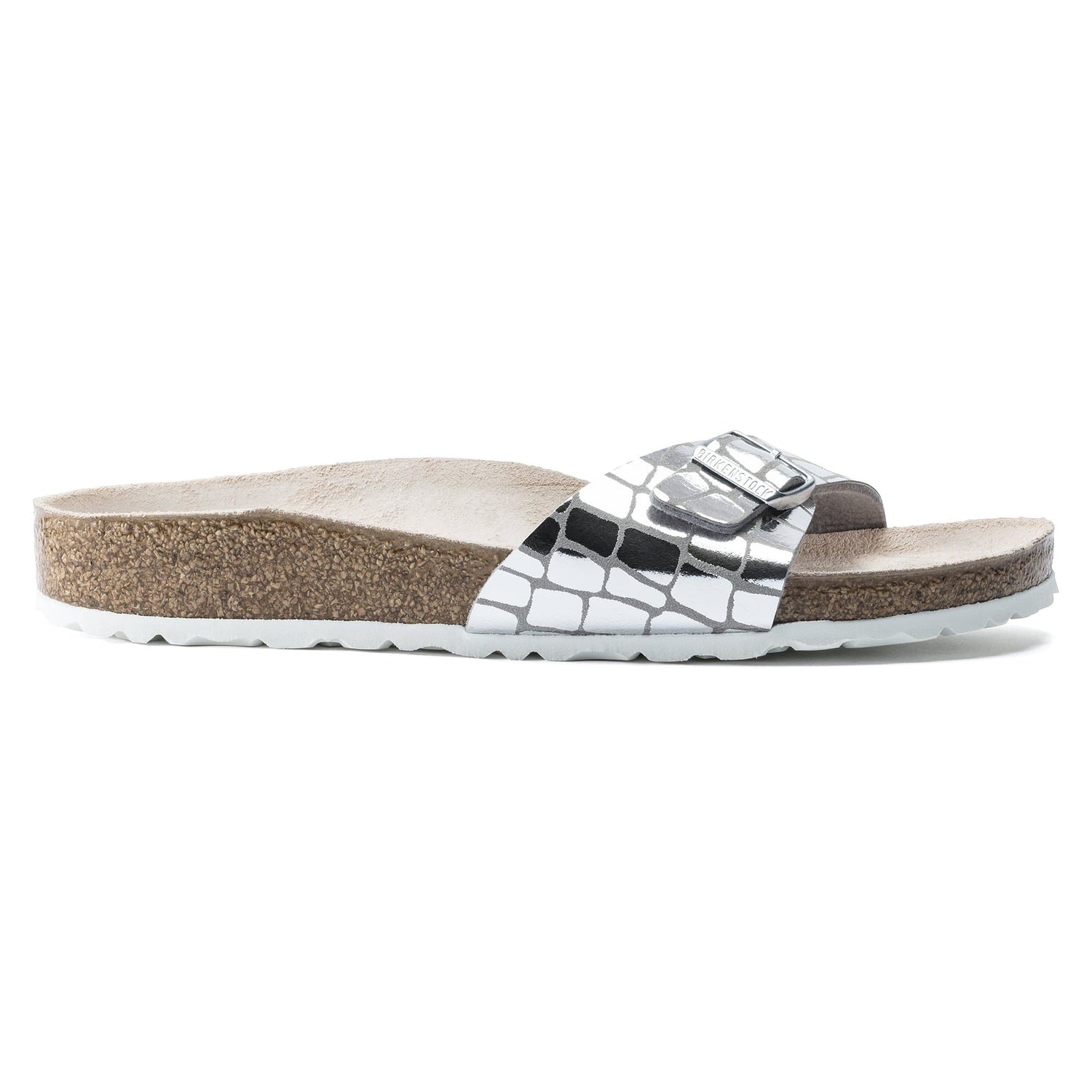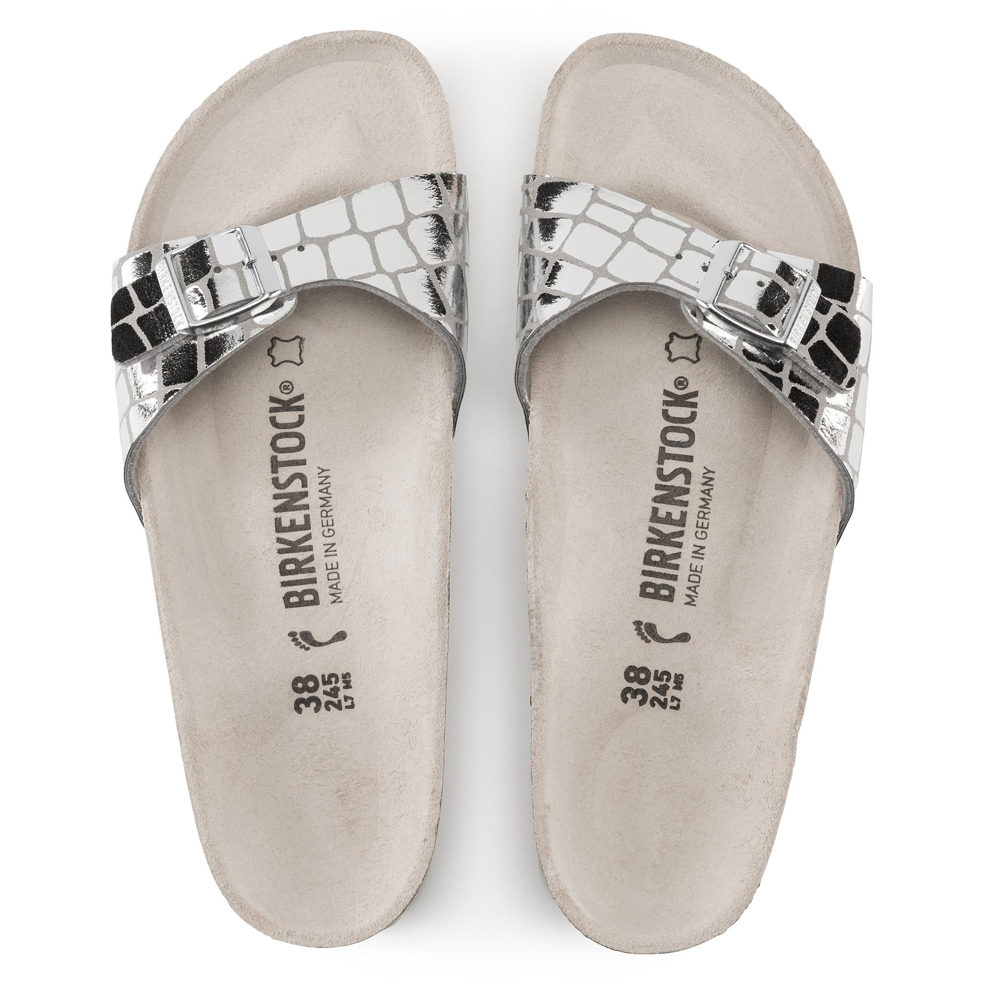 The BIRKENSTOCK Madrid Micro Fibre Pink and Silver sandal is a veritable classic that delights the world of fashion with its minimalist design. This version sports an alligator pattern and an eye-catching microfiber material made with a matte base combined with a shiny-effect film. Inspired by nature, no two shoes have the same look and feel. The color-coordinated footbed rounds off the shoe'­s look of sophistication. The upper is made from skin-friendly microfiber.