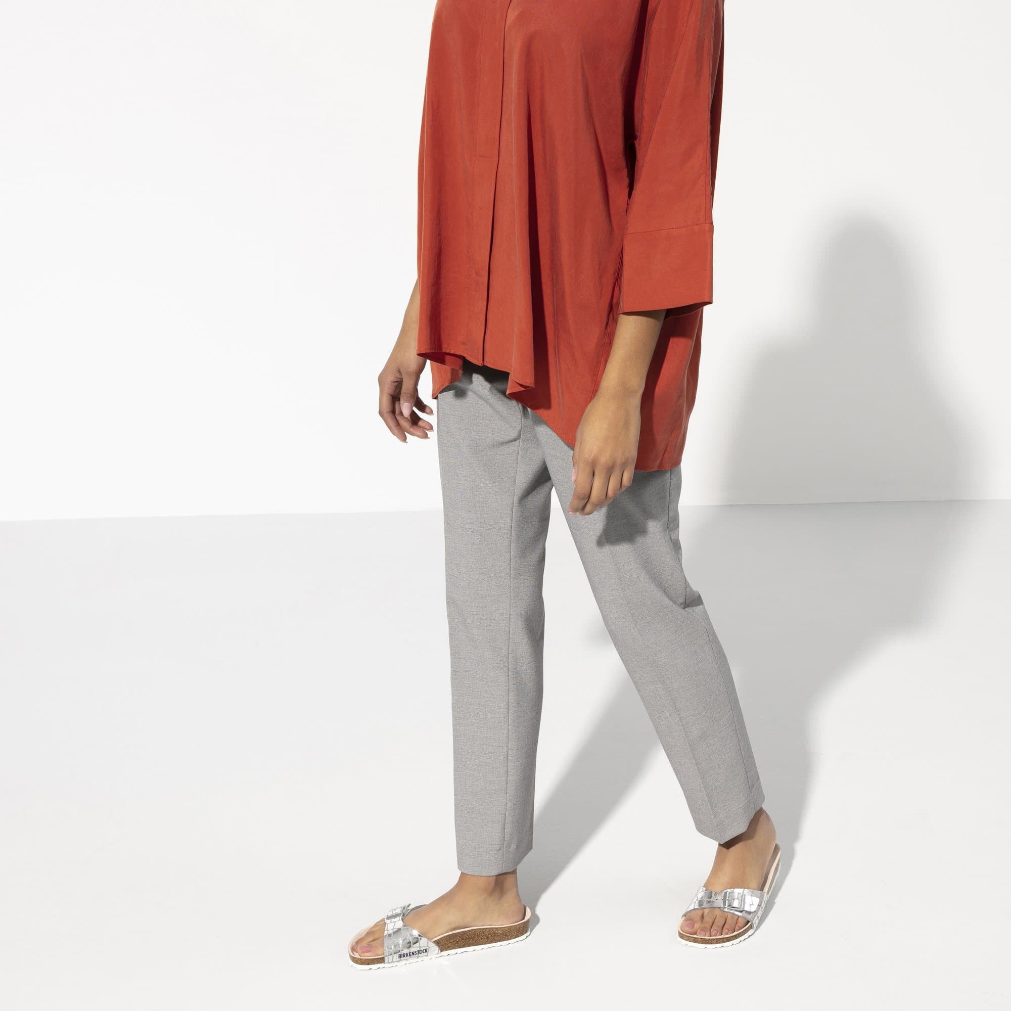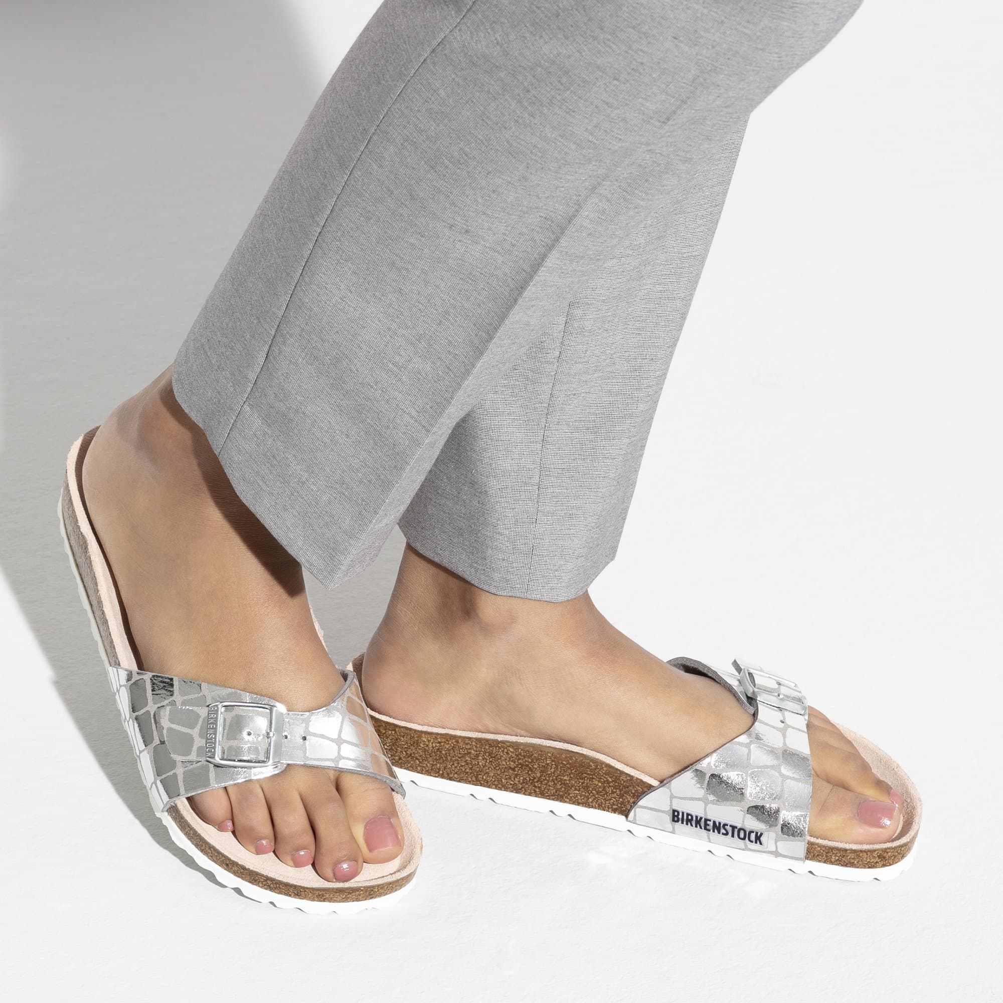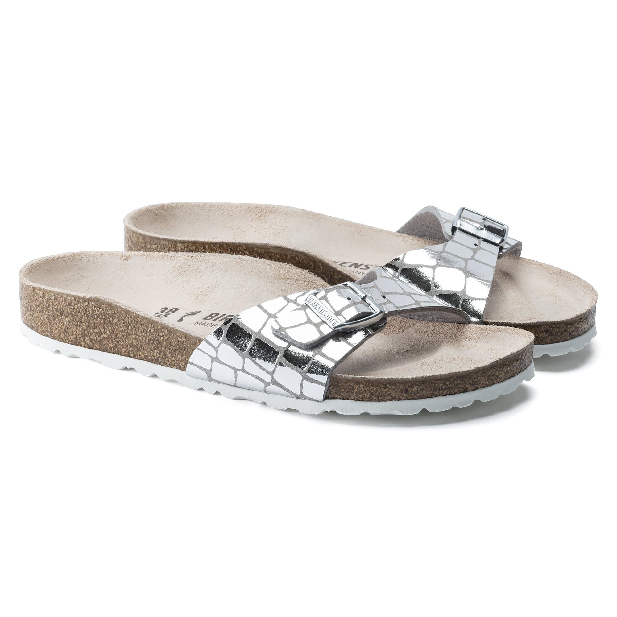 The BIRKENSTOCK Madrid Micro Fibre Pink and Silver sandal is a veritable classic that delights the world of fashion with its minimalist design. This version sports an alligator pattern and an eye-catching microfiber material made with a matte base combined with a shiny-effect film. Inspired by nature, no two shoes have the same look and feel. The color-coordinated footbed rounds off the shoe'­s look of sophistication. The upper is made from skin-friendly microfiber.
