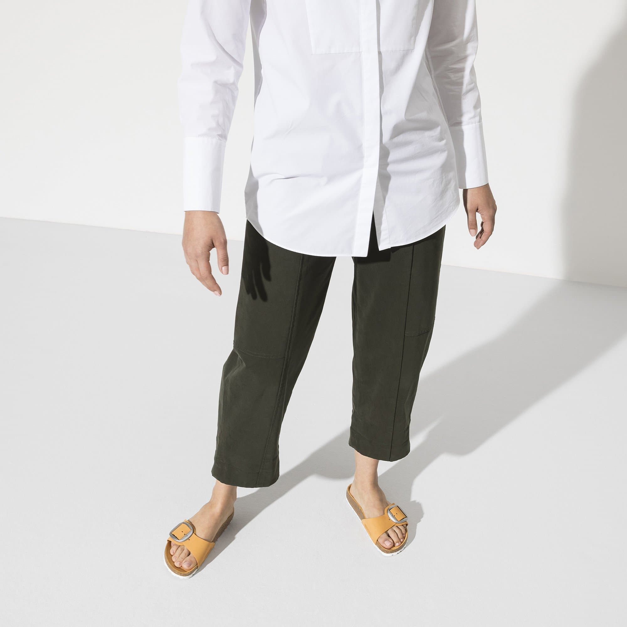 The BIRKENSTOCK Madrid Big Buckle Nubuck Leather Apricot Sandal is a veritable classic that delights the world of fashion with its minimalist design. The Big Buckle version features a large, elegant pin buckle a fantastic, striking eye-catcher on this otherwise understated sandal. The upper is made from high-quality nubuck leather that boasts a natural, rustic appearance.