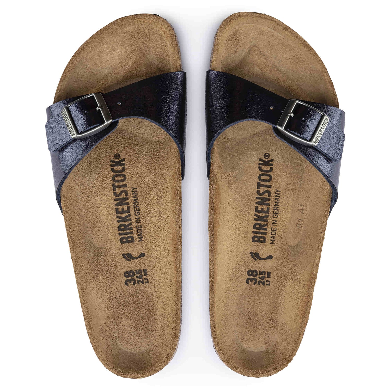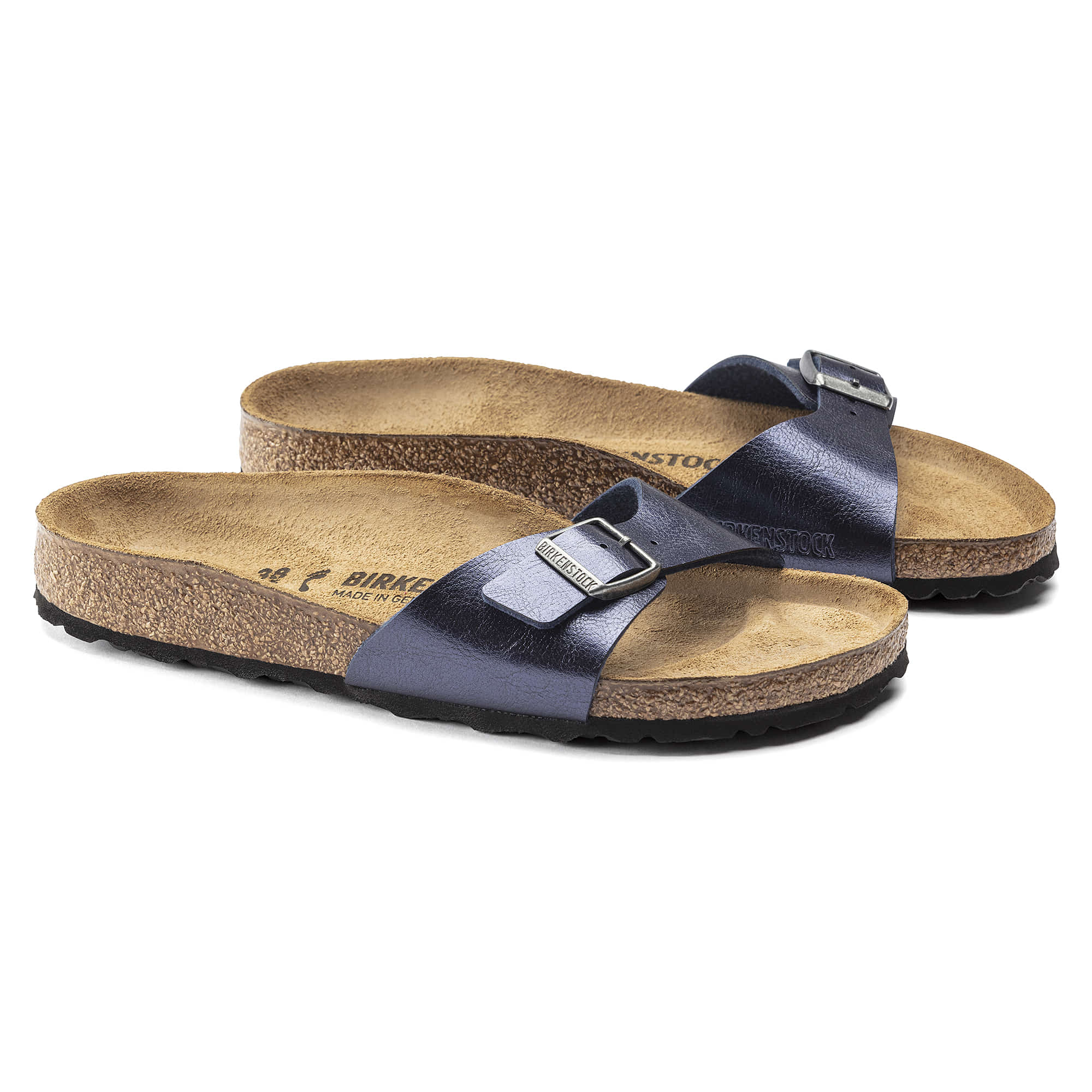 A strap, a buckle and a contoured cork footbed are masterfully combined to create the original Birkenstock Madrid Birko-Flor Graceful Midnight Blue Sandal. Available in vegan materials and includes an upper made from the skin-friendly, hard-wearing synthetic material, Birkibuc.