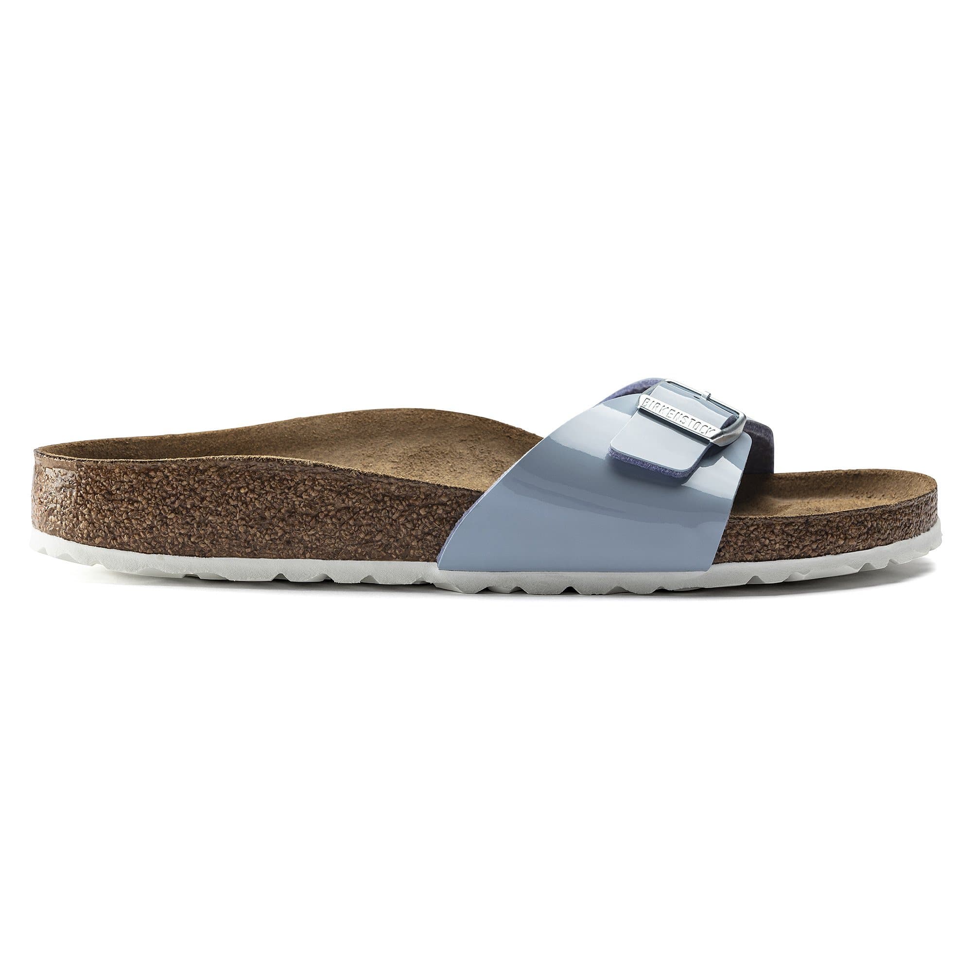 The BIRKENSTOCK Madrid Birko-Flor Patent Patent Dove Blue Sandal is the oldest member of the family of models, making it a veritable classic. Launched as a gymnastics sandal half a century ago, this simple single-strap model has gone on to become a firm fashion favorite. The upper is made from the skin-friendly, hard-wearing synthetic material Birko-Flor® with a shiny patent coating.