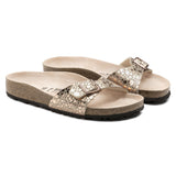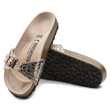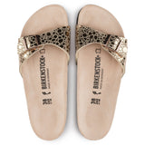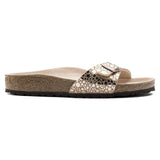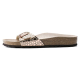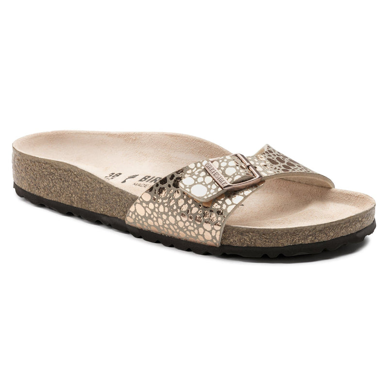 A strap, a buckle and a contoured cork footbed are masterfully combined to create the original Birkenstock sandal - the Madrid. This simple, iconic slide expresses the minimalist tradition that still guides BIRKENSTOCK design to this today. Metallic Stones has all the stunning qualities that are destined to make it a bestselling addition to the BIRKENSTOCK family. It has a distinct flair that isn'­t too flashy but is definitely fun. The material showcases a special shading of microfiber and metallic stones that result in a look that is both matte and shiny, and the color-coordinated footbed liner supports the elegance of the upper material.