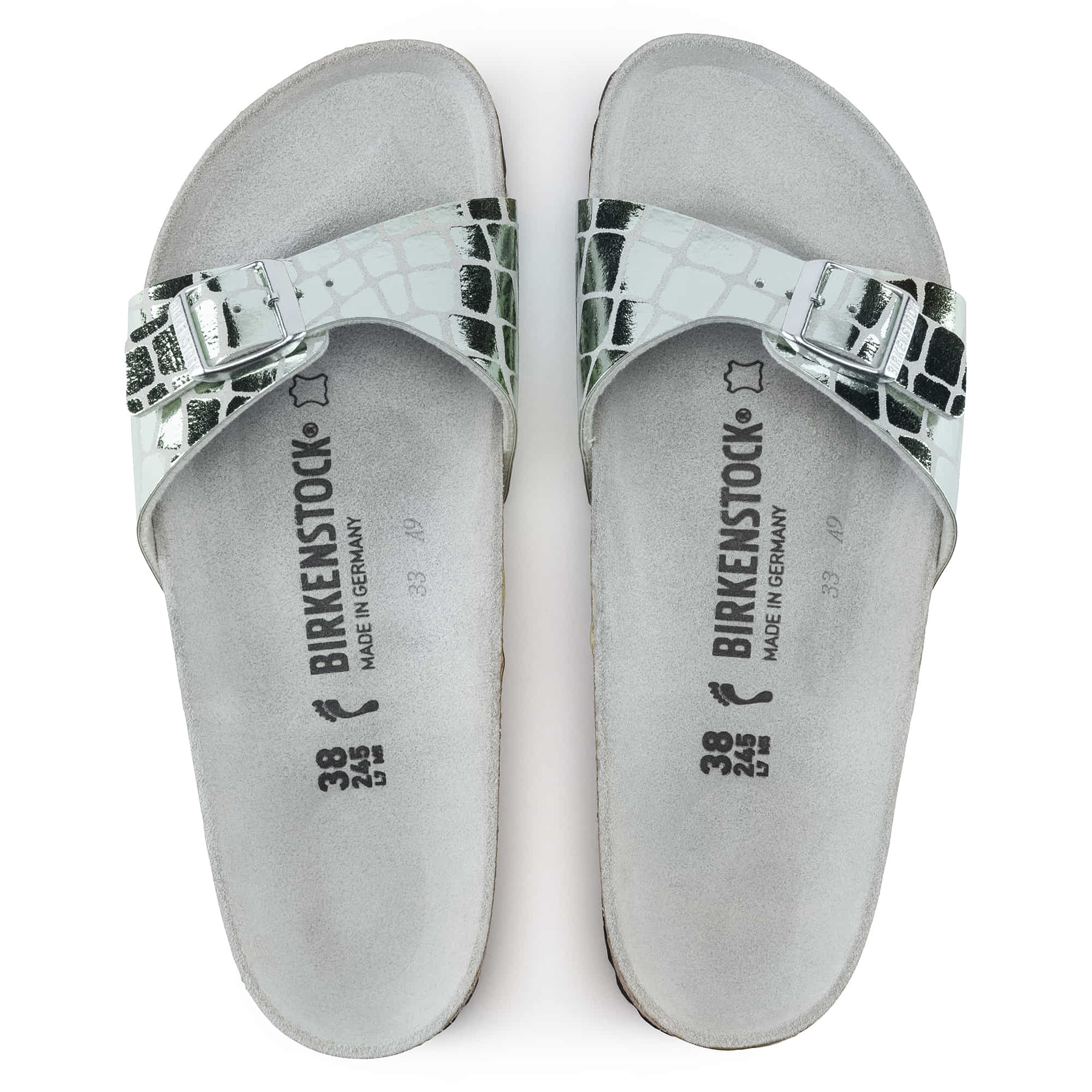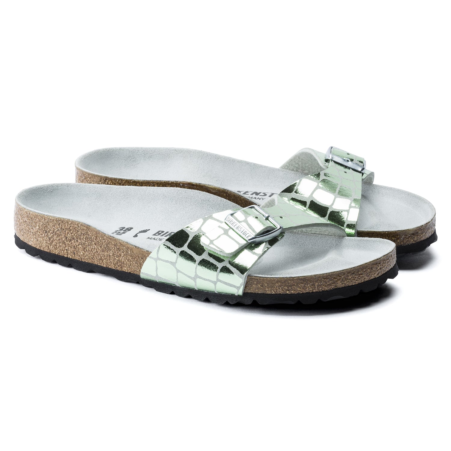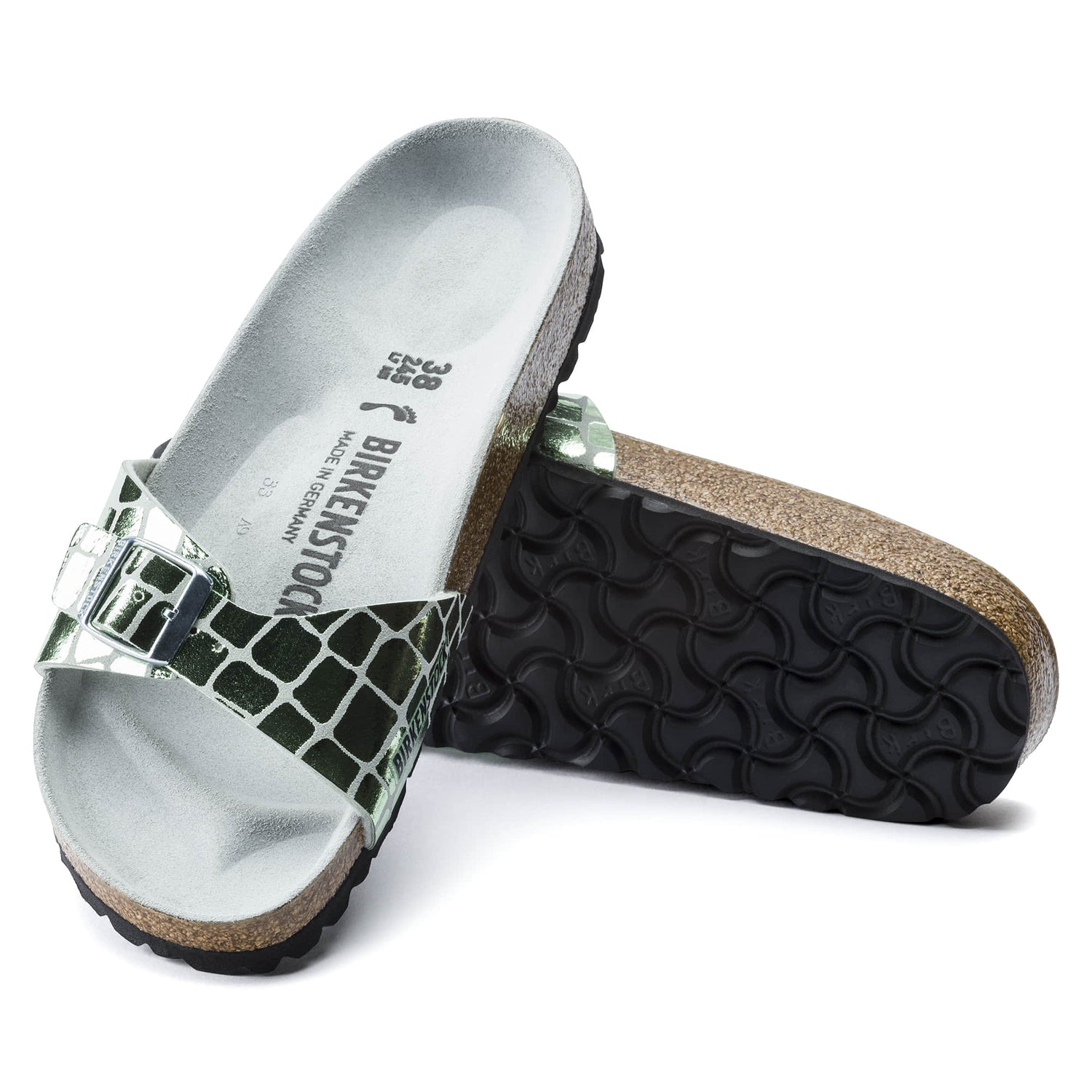 The BIRKENSTOCK Madrid Micro Fibre Green sandals a veritable classic that delights the world of fashion with its minimalist design. This version sports an alligator pattern and an eye-catching microfiber material made with a matte base combined with a shiny-effect film. Inspired by nature, no two shoes have the same look and feel. The color-coordinated footbed rounds off the shoe's look of sophistication. The upper is made from skin-friendly microfiber.