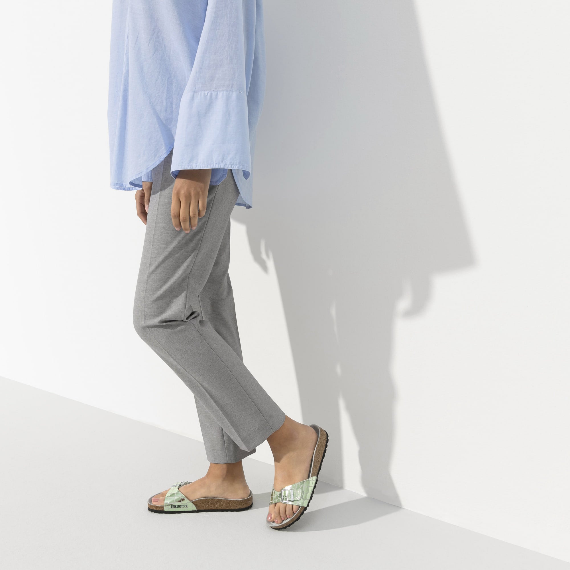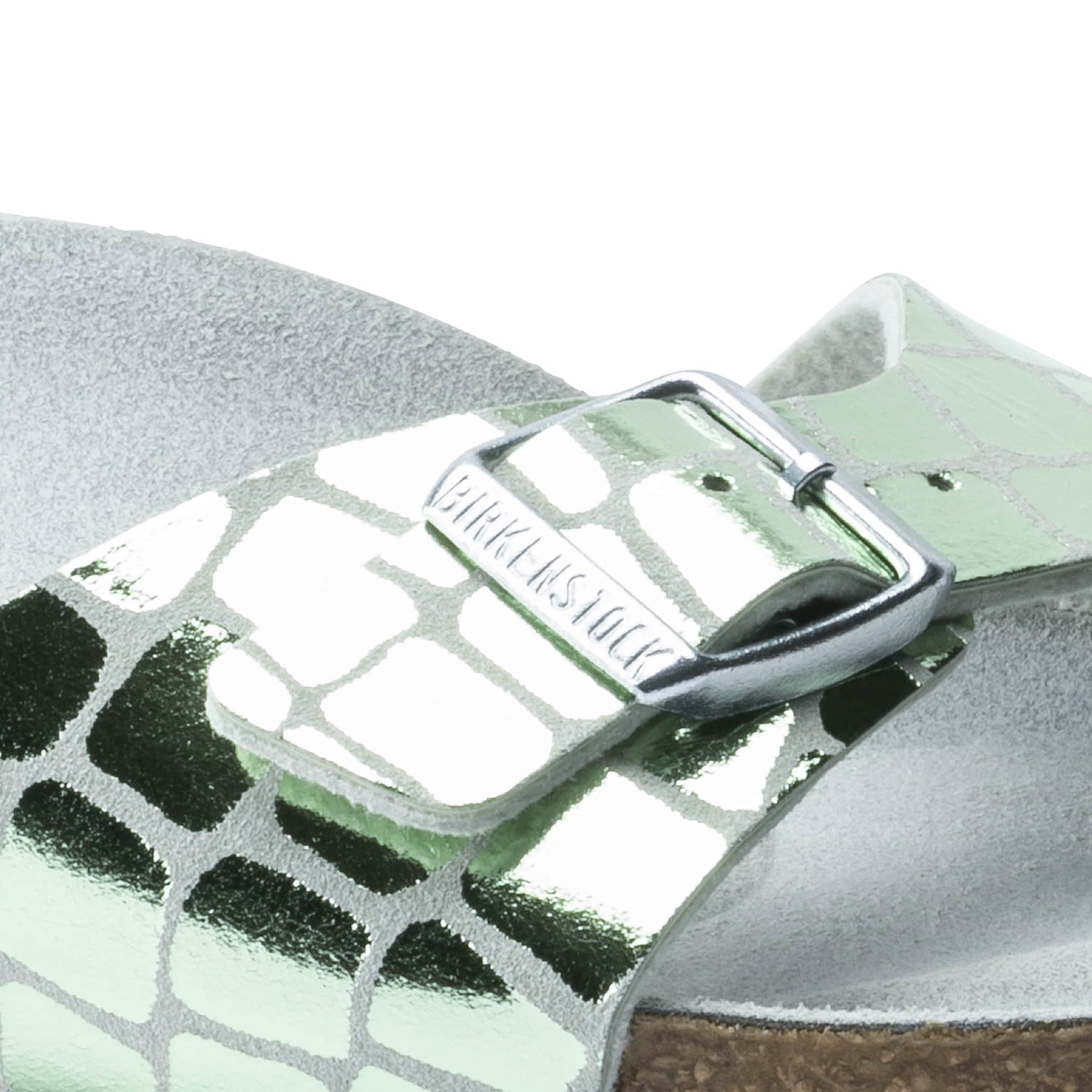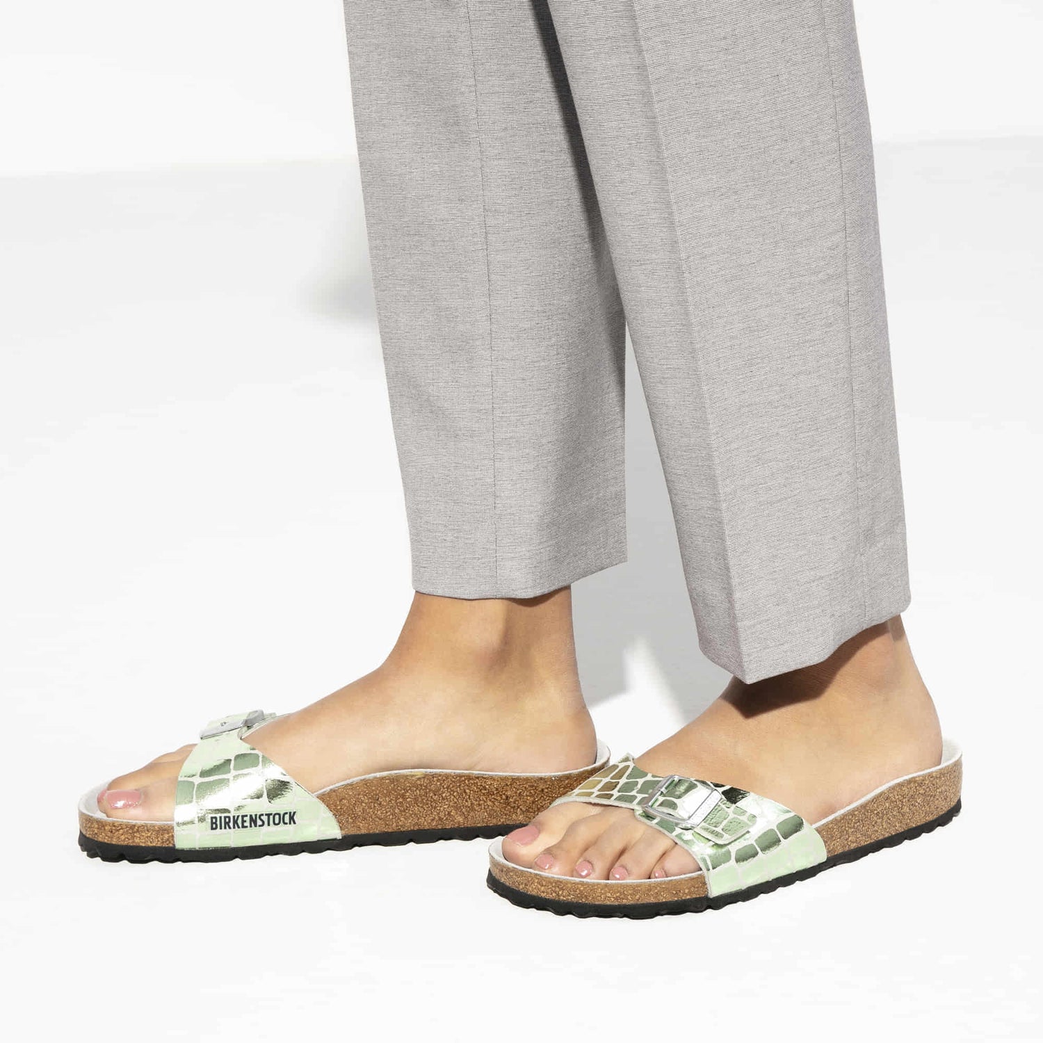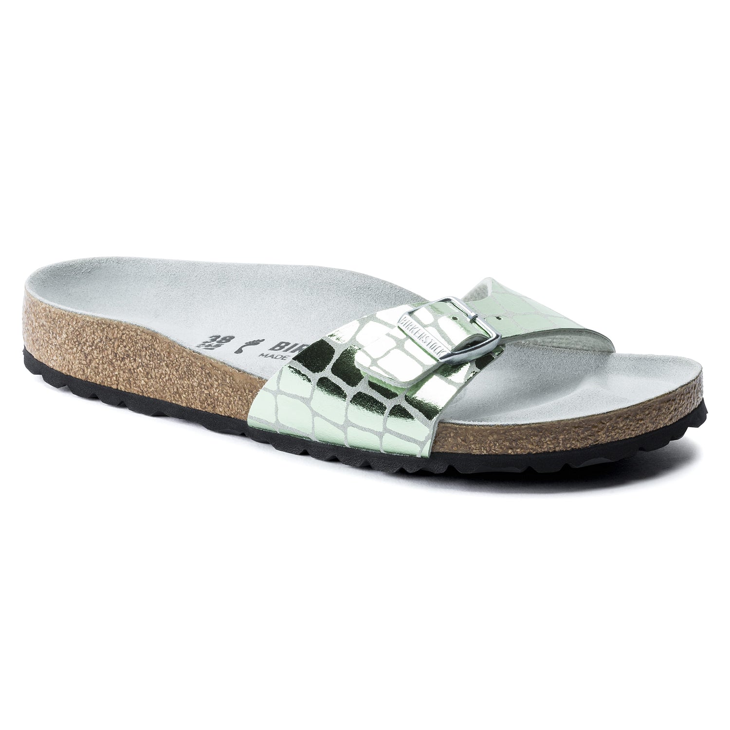 The BIRKENSTOCK Madrid Micro Fibre Green sandals a veritable classic that delights the world of fashion with its minimalist design. This version sports an alligator pattern and an eye-catching microfiber material made with a matte base combined with a shiny-effect film. Inspired by nature, no two shoes have the same look and feel. The color-coordinated footbed rounds off the shoe's look of sophistication. The upper is made from skin-friendly microfiber.