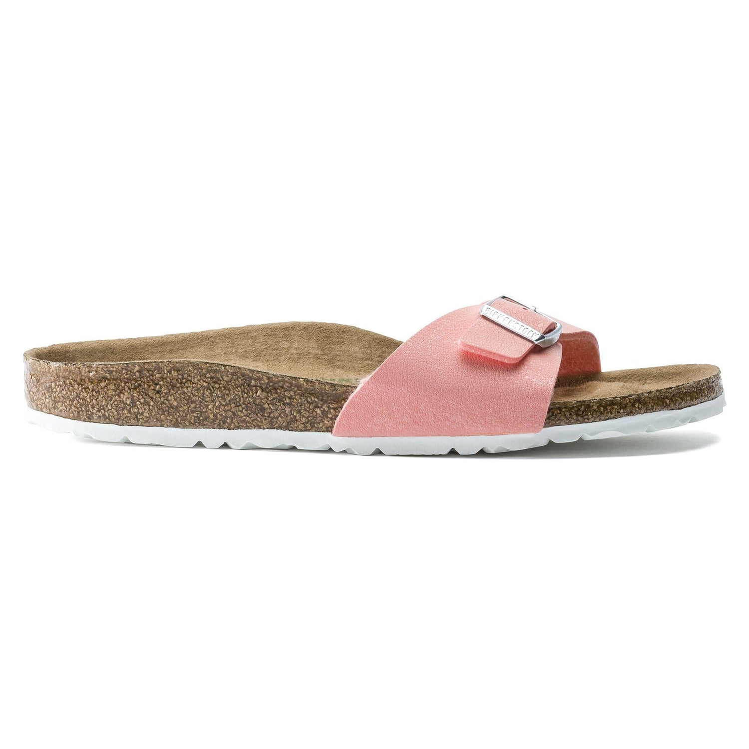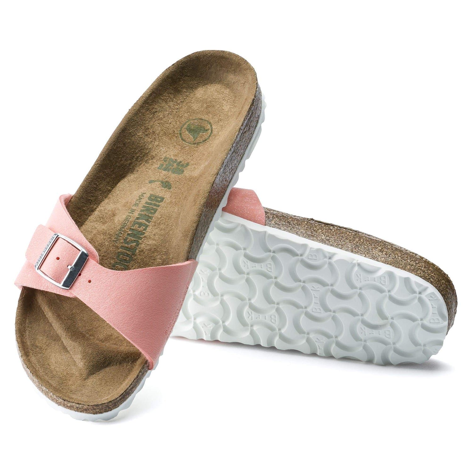 The BIRKENSTOCK Madrid Vegan Birko-Flor Nubuck Blue/Brushed Dove and Orange/Brushed Flamingo sandals a veritable classic that delights the world of fashion with its minimalist design. This popular sandal has been given an update in a new material, with a vegan version now available. It is entirely free of animal products, as verified by independent testing laboratories. The upper is made from the skin-friendly, hard-wearing synthetic material Birko-Flor® in a sophisticated nubuck look. Thanks to clever play with the material, the brushed Birko-Flor® could almost be mistaken for real leather.