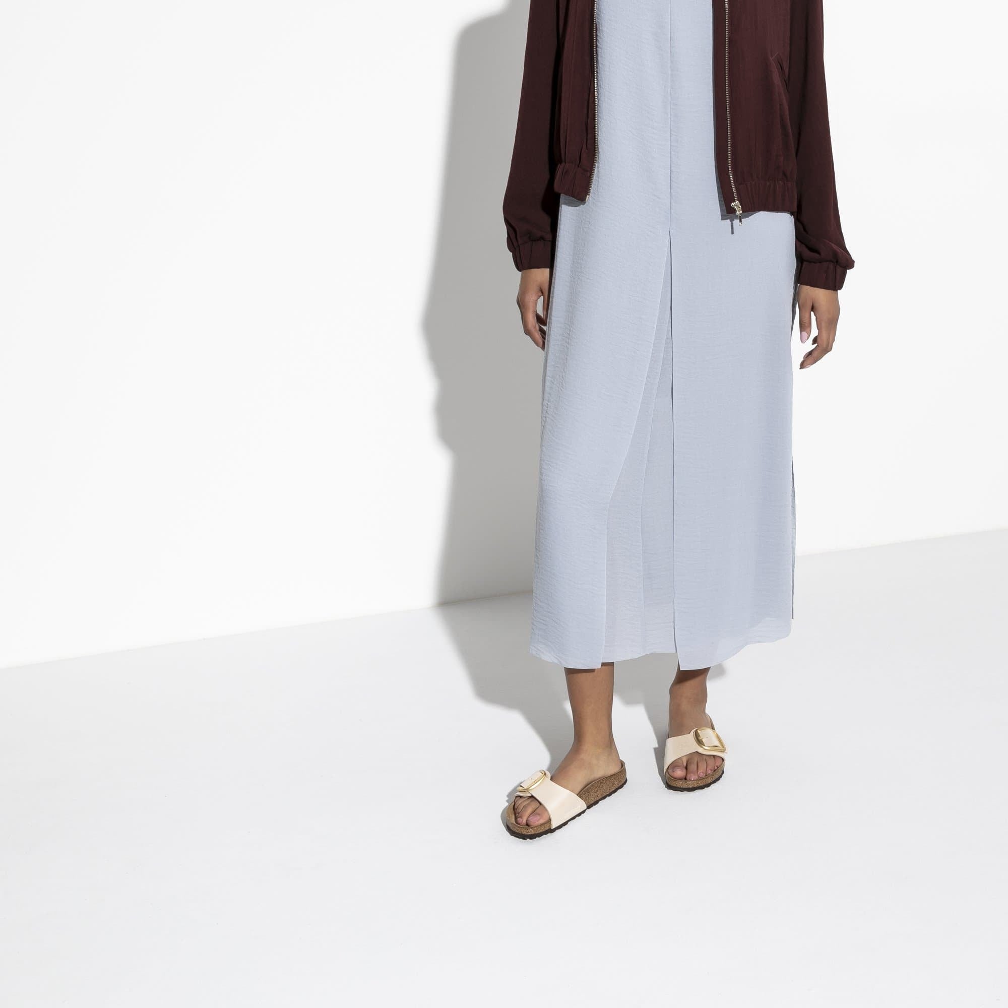 The BIRKENSTOCK Madrid Big Buckle Birko-Flor Black/Graceful Licorice, White/Graceful Pearl and Brown/Graceful Taupe sandals a genuine classic that delights the fashion world with its simplistic design. This model combines two popular designs, with a subtle, silky gloss finish and a large, elegant pin buckle. The upper is made of skin-friendly and durable Birko-Flor synthetic material.