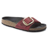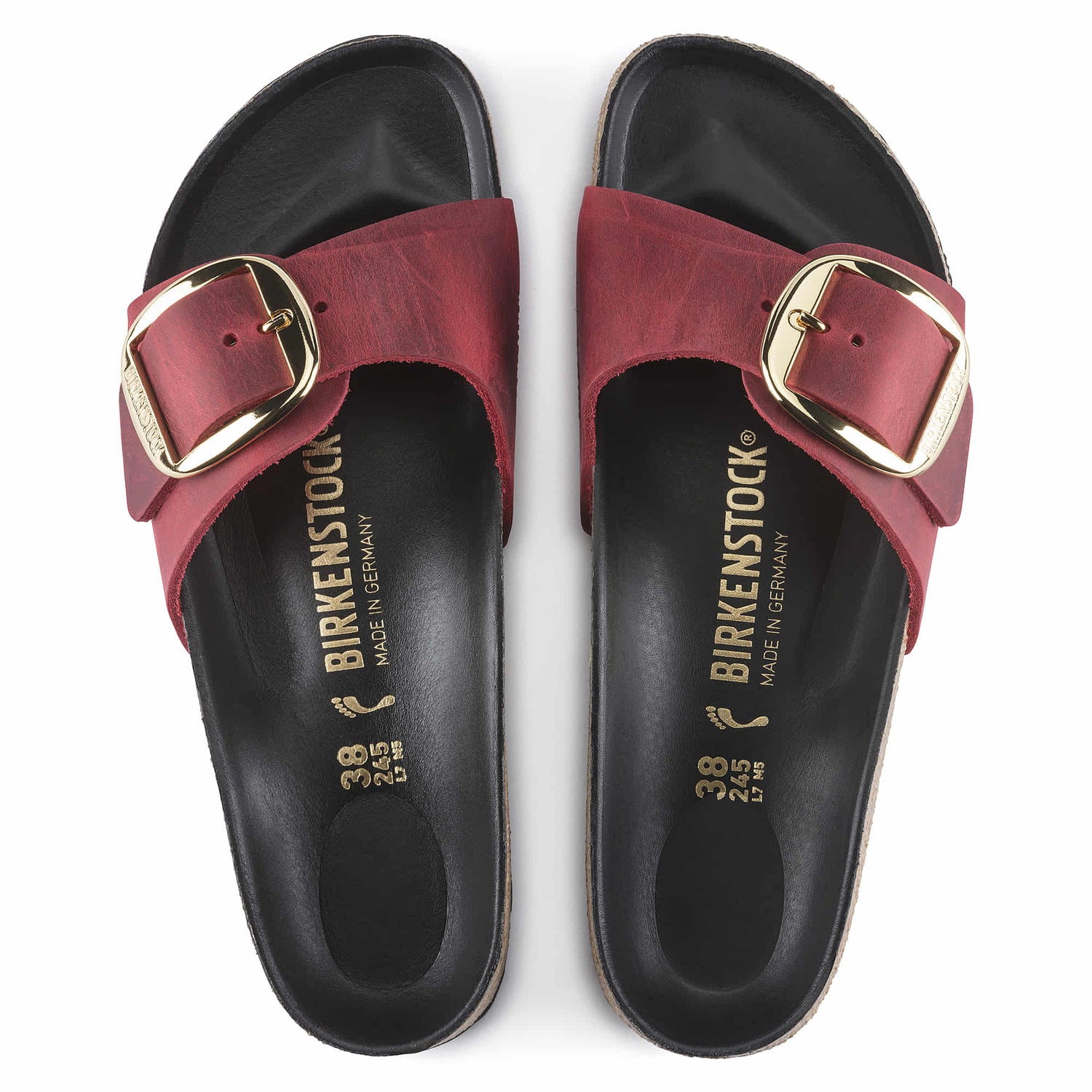 The BIRKENSTOCK Madrid Big Buckle Oiled Leather Red sandal is a genuine classic that delights the world of fashion with its minimalist design. The Big Buckle version features a large, elegant pin buckle a fantastic, striking eye-catcher on this otherwise understated sandal. The lining of the semi-exquisite footbed is covered with soft smooth leather and matches the shoe in color. The upper is made from extra thick, oiled nubuck leather with an open-selvage finish.