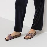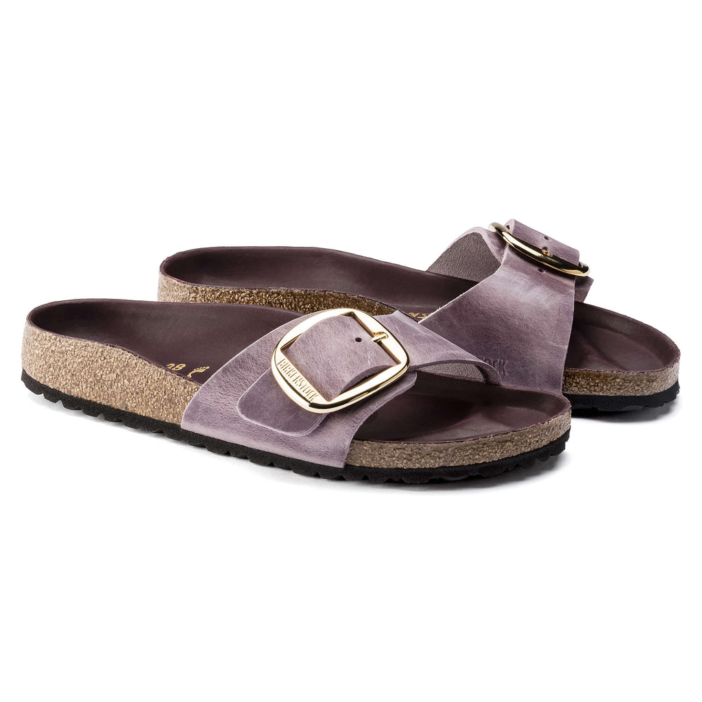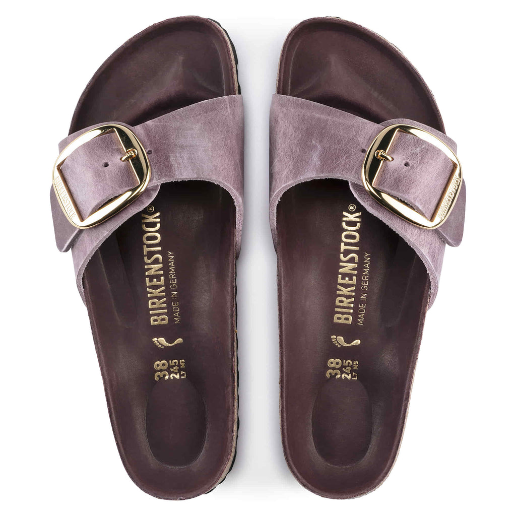 The BIRKENSTOCK Madrid is a genuine classic that delights the world of fashion with its minimalist design. The Big Buckle version features a large, elegant pin buckle “ a fantastic, striking eye-catcher on this otherwise understated sandal. The lining of the semi-exquisite footbed is covered with soft smooth leather and matches the shoe in color. The upper is made from extra thick, oiled nubuck leather with an open-selvage finish.