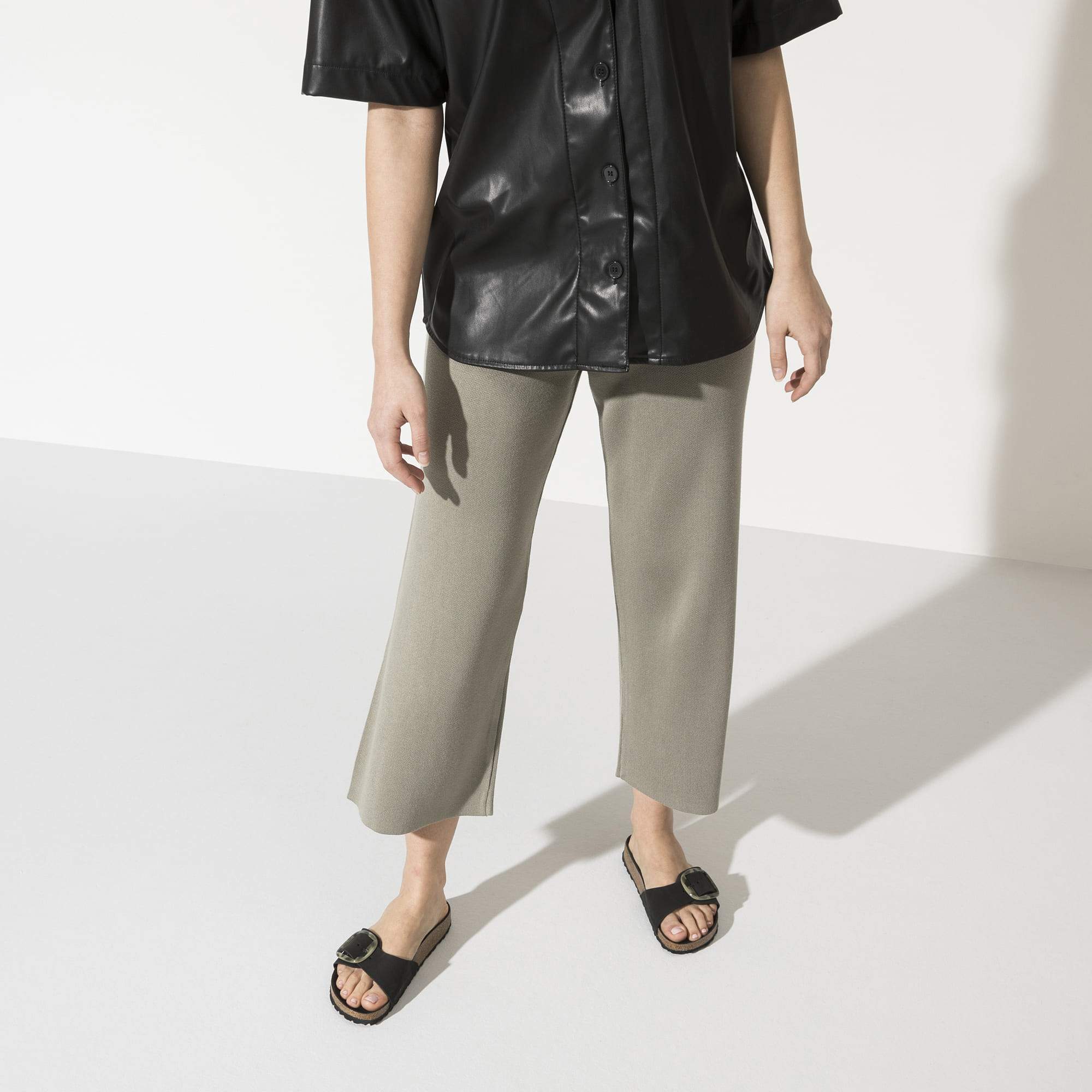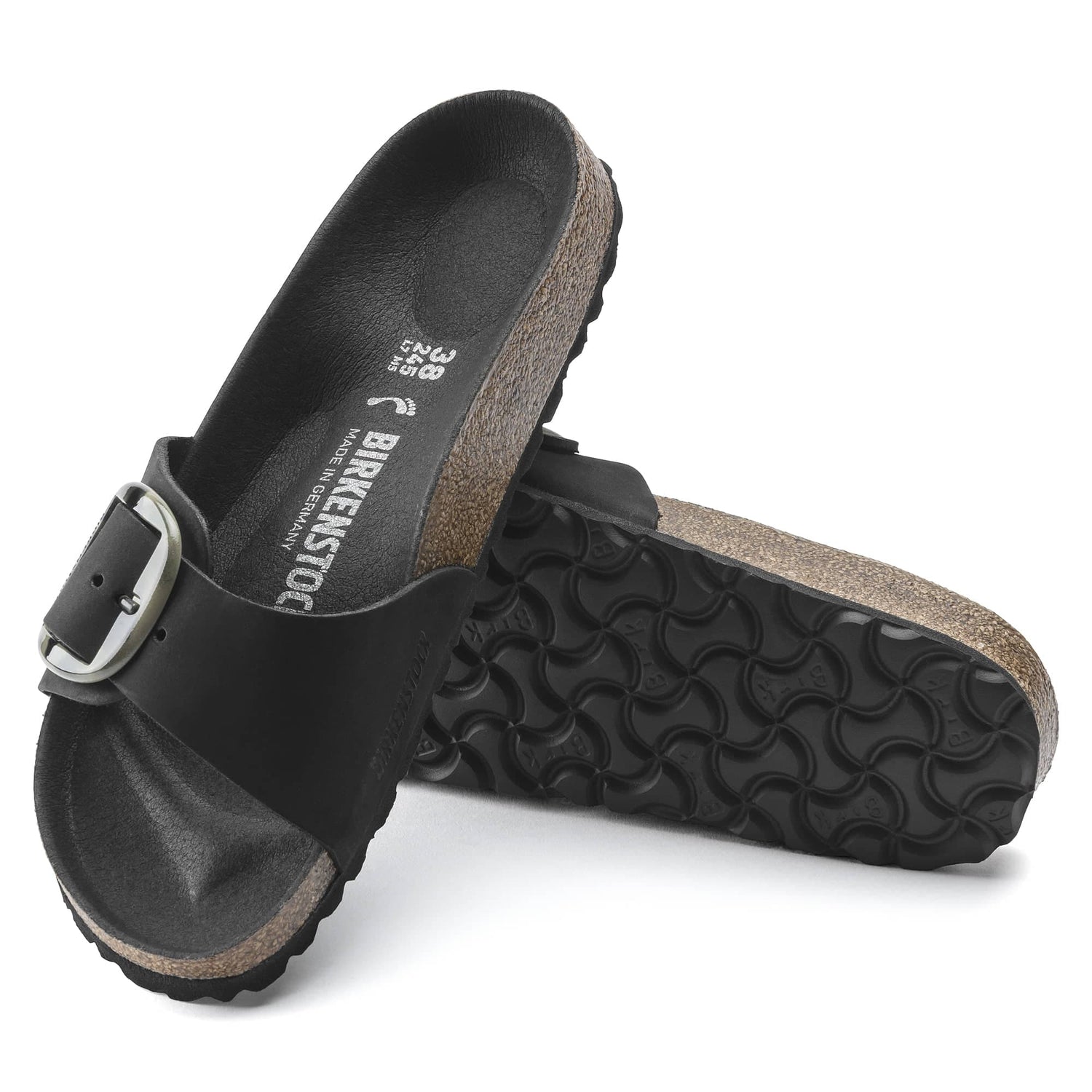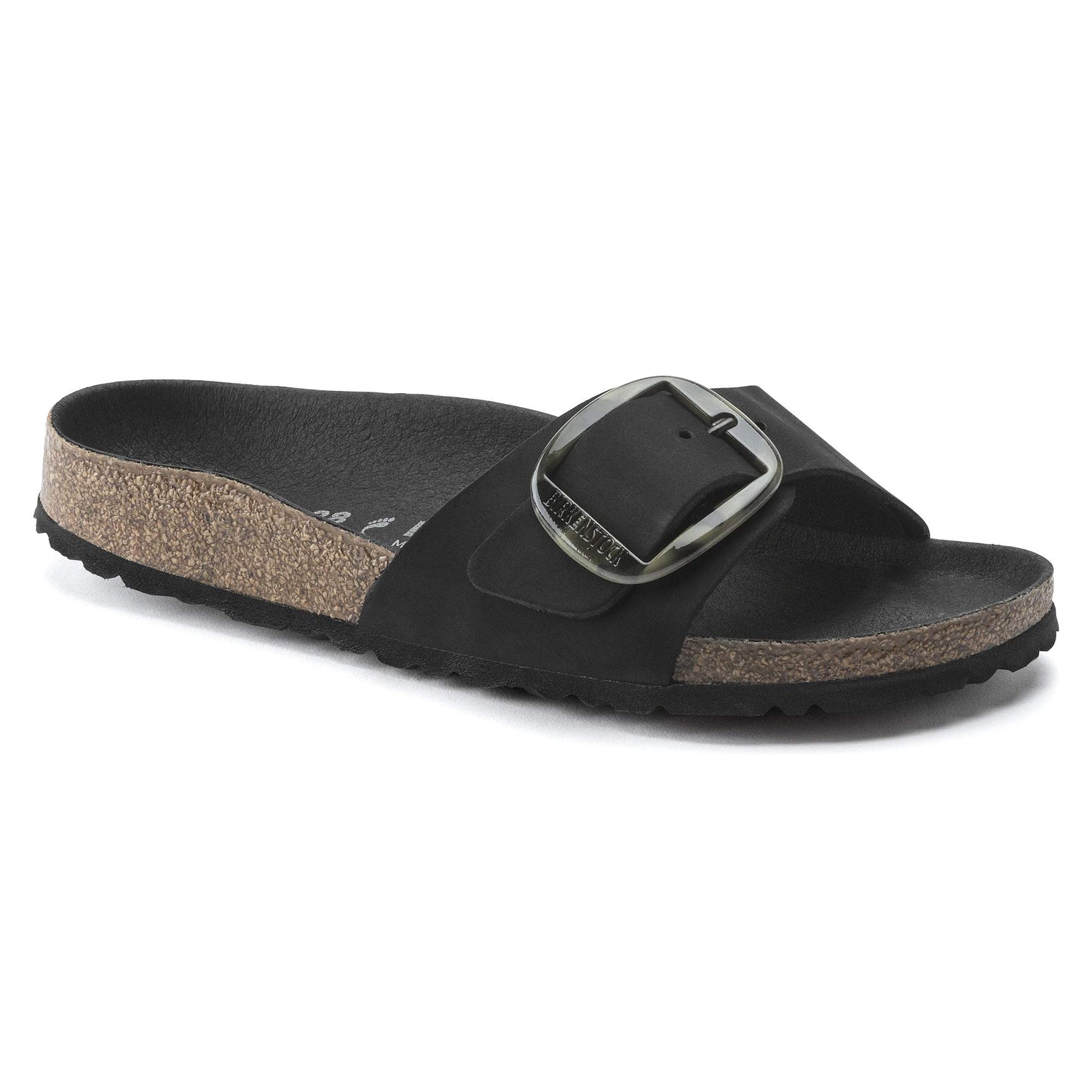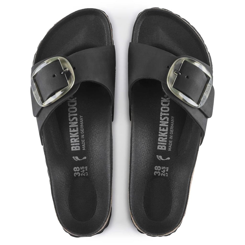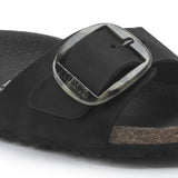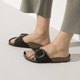 The BIRKENSTOCK Madrid Big Buckle Nubuck Leather beige and black sandal is a genuine classic that delights the world of fashion with its minimalist design. The Big Buckle version features a large, elegant pin buckle a fantastic, striking eye-catcher on this otherwise understated sandal. The upper is made from high-quality nubuck leather that boasts a natural, rustic appearance.