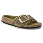 The BIRKENSTOCK Madrid is a genuine classic that delights the world of fashion with its minimalist design. This model comes in a particularly cozy version with a color-coordinated shearling lining and straps lined with shearling as well as a big, elegant pin buckle. The upper is made from extra thick, oiled nubuck leather with an open-selvage finish.