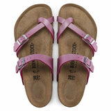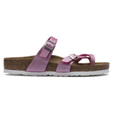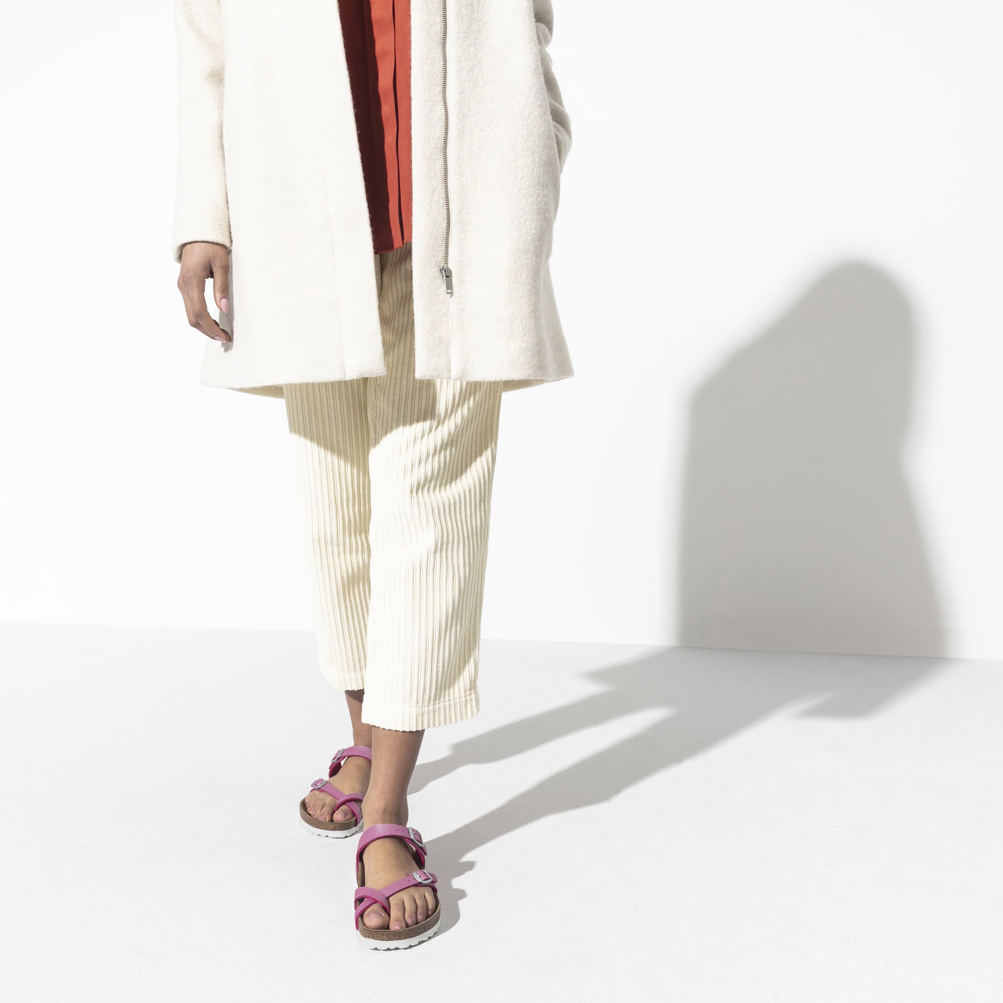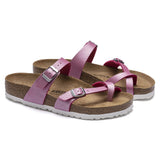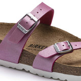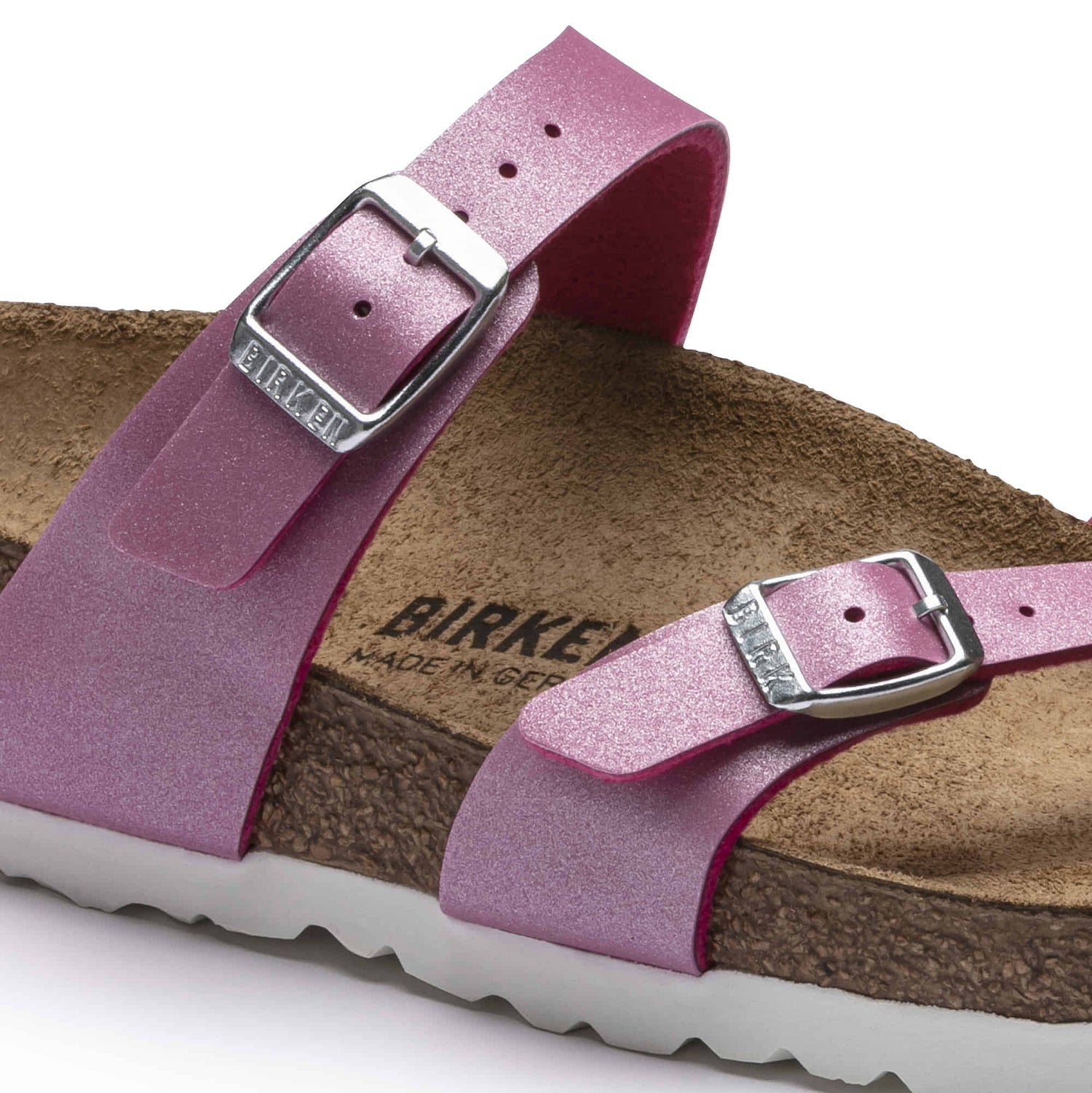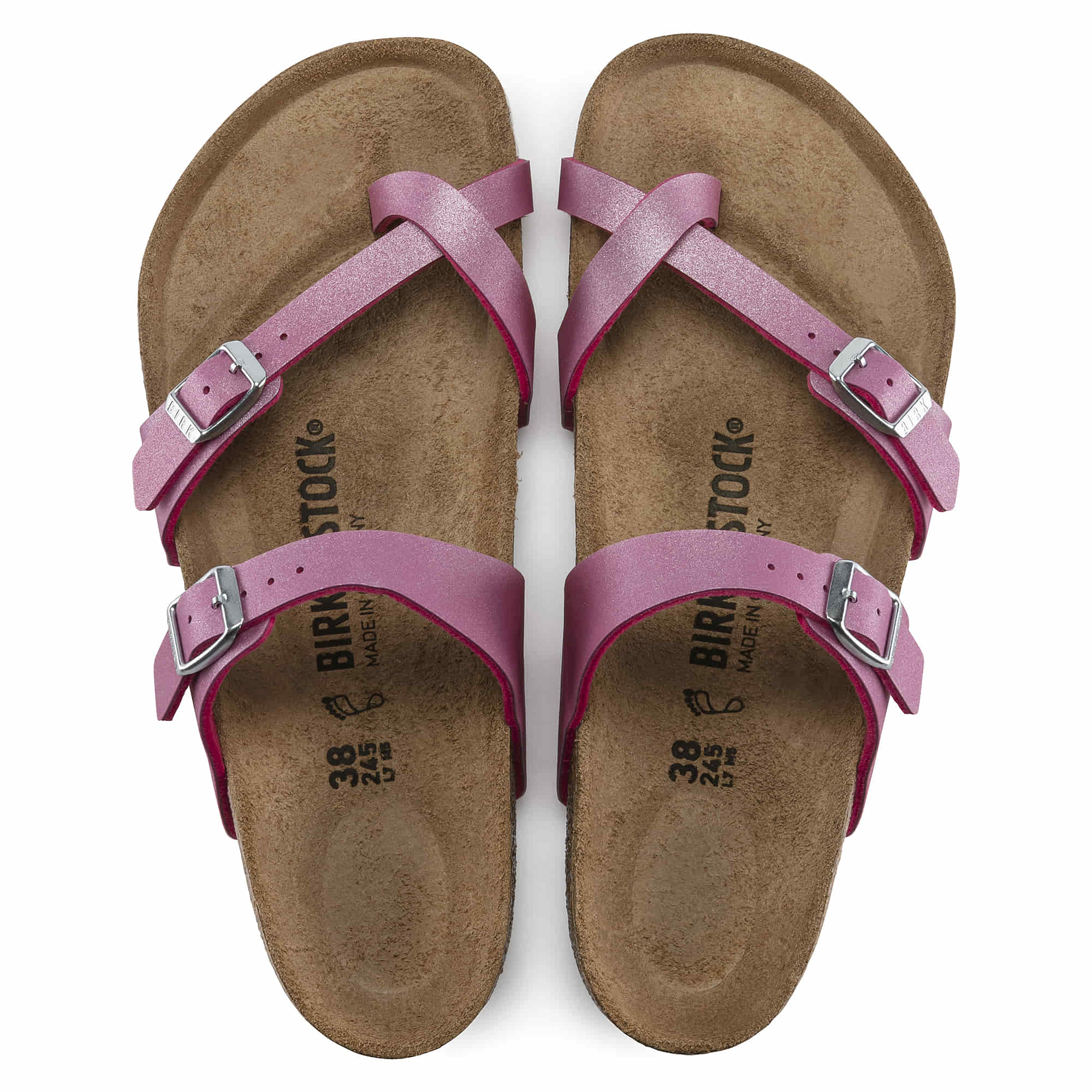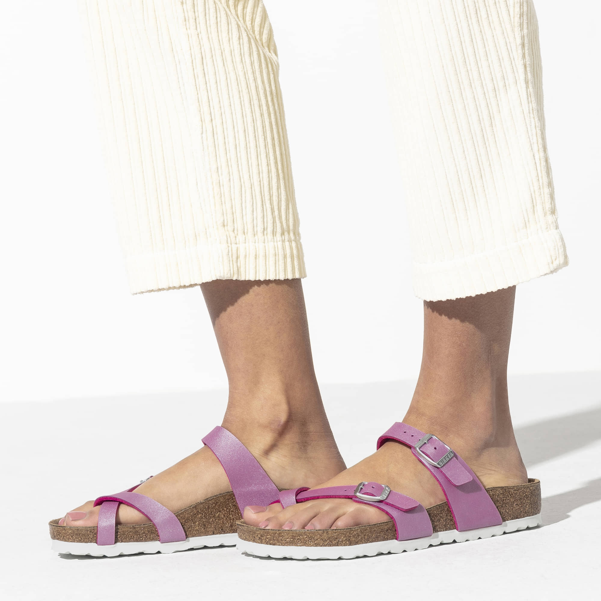 Jaunty and modern! The BIRKENSTOCK Mayari thong sandal stands out with its flowing look and brings together design and comfort. This version is for anyone who likes a bit of sparkle while still maintaining a more understated look. The matte glitter effect is subtle, but still catches the eye. The upper is made from the skin-friendly, hard-wearing synthetic material Birko-Flor®.