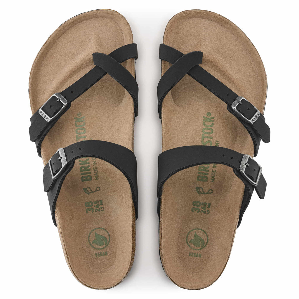 Jaunty and modern! The BIRKENSTOCK Mayari thong sandal stands out with its flowing look and brings together design and comfort. The color-coordinated outsole rounds off the shoes look of sophistication. This popular sandal has been given an update in a new material, with a vegan version now available. It is entirely free of animal products, as verified by independent testing laboratories. The upper is made from the skin-friendly, hard-wearing synthetic material Birko-Flor® in a sophisticated nubuck look which boasts a texture and color that could almost be mistaken for real leather.