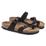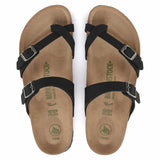 Jaunty and modern! The BIRKENSTOCK Mayari thong sandal stands out with its flowing look and brings together design and comfort. The color-coordinated outsole rounds off the shoe's look of sophistication. This popular sandal has been given an update in a new material, with a vegan version now available. It is entirely free of animal products, as verified by independent testing laboratories. The upper is made from the skin-friendly, hard-wearing synthetic material Birko-Flor® in a sophisticated nubuck look which boasts a texture and color that could almost be mistaken for real leather.