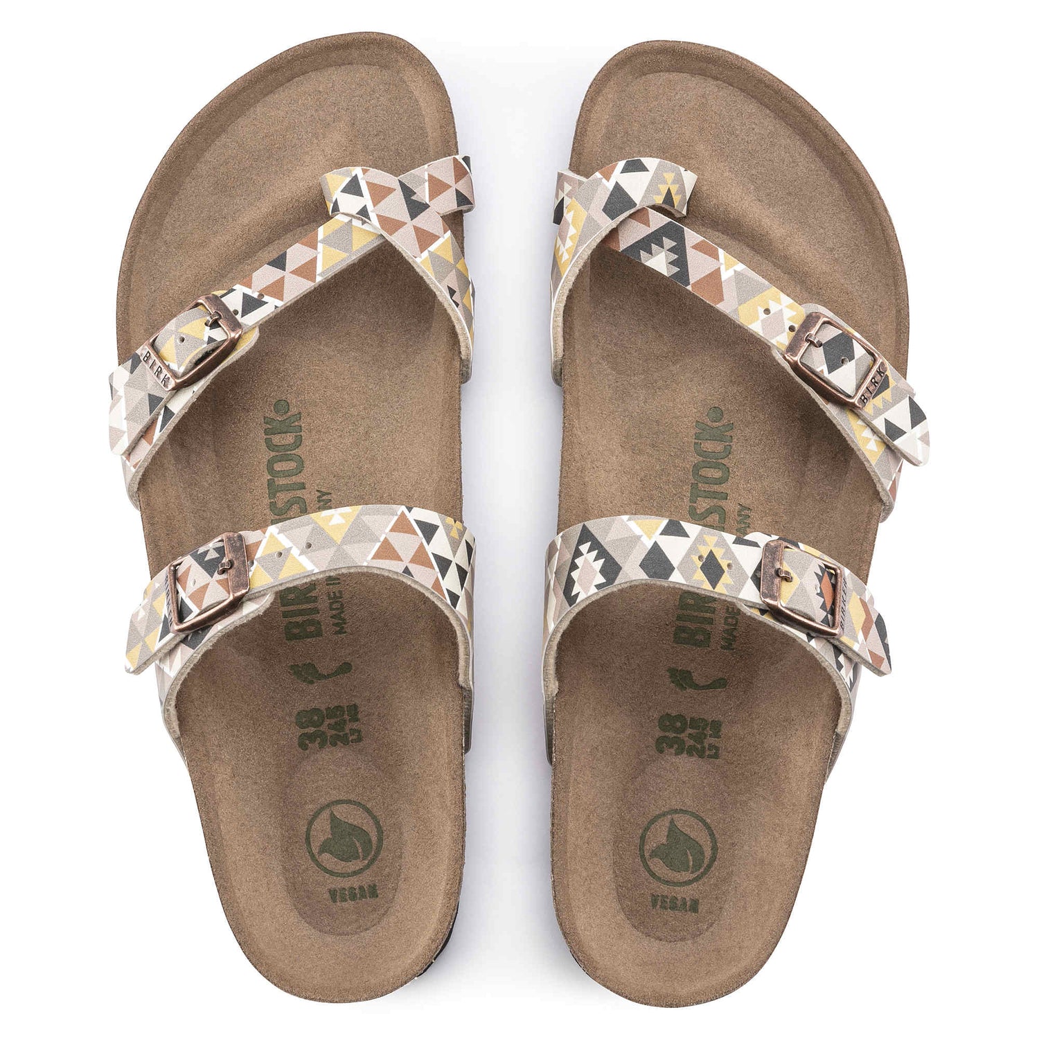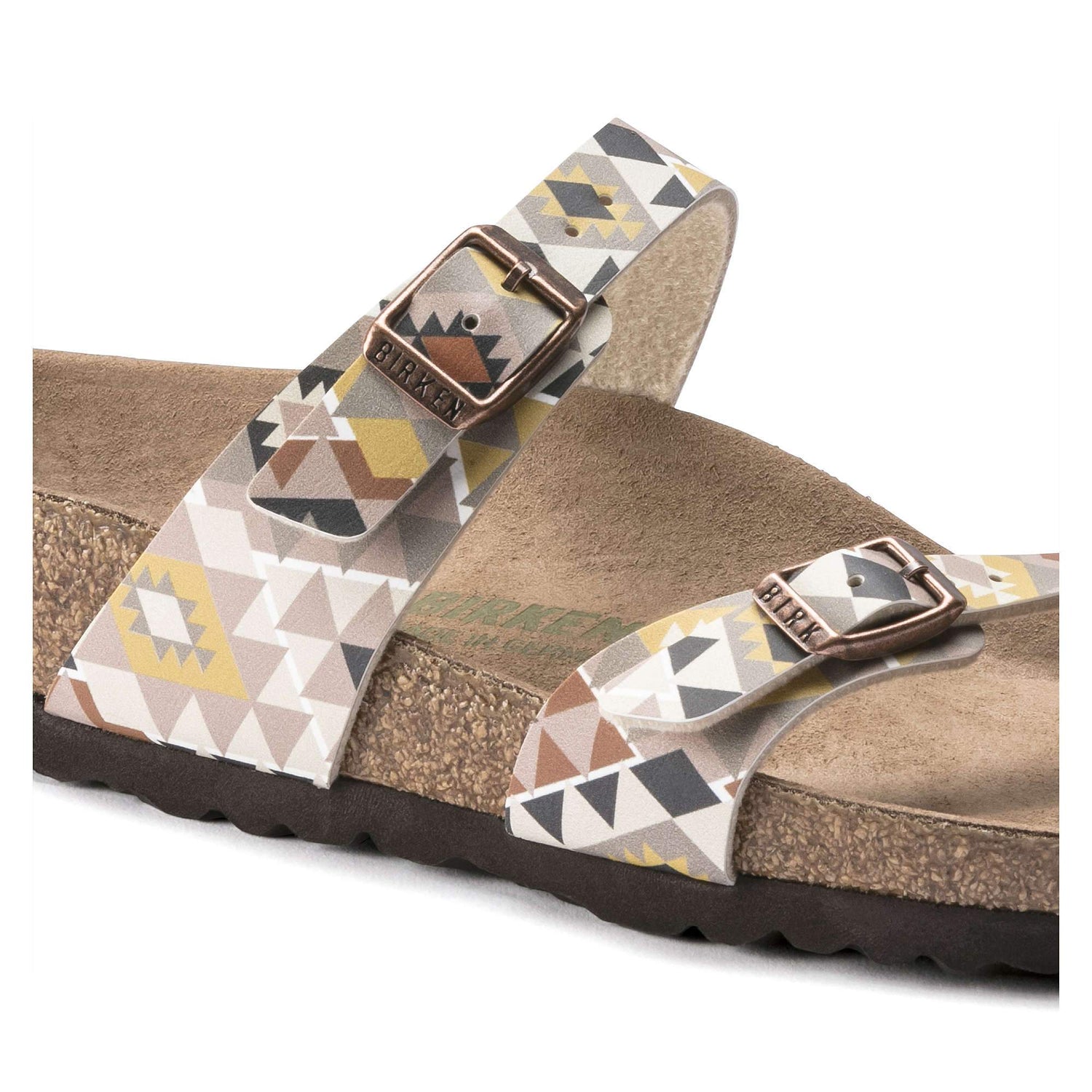 Jaunty and modern! The BIRKENSTOCK Mayari thong sandal stands out with its flowing look and brings together design and comfort. This version features an ethnic print. Perfect for modern boho styles! This popular sandal has been given an update in a new material, with a vegan version now available. It is entirely free of animal products, as verified by independent testing laboratories. The upper is made from the skin-friendly, hard-wearing synthetic material Birko-Flor®.