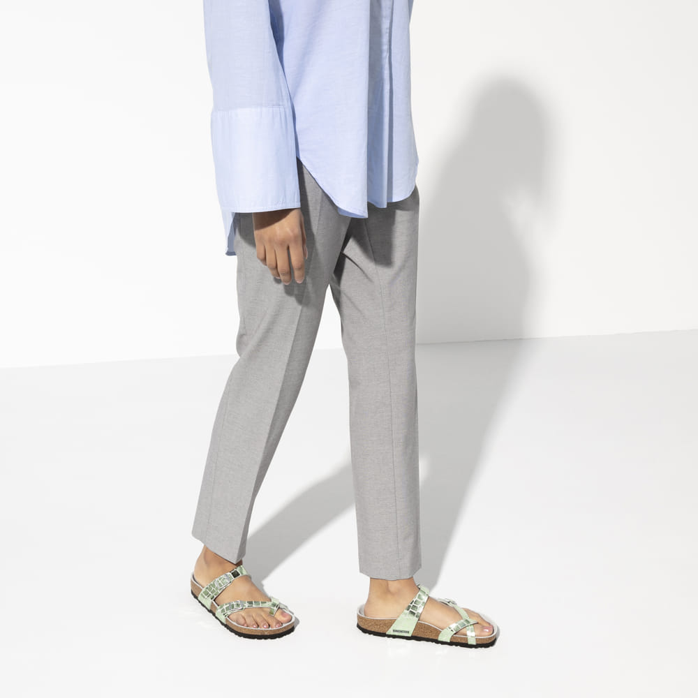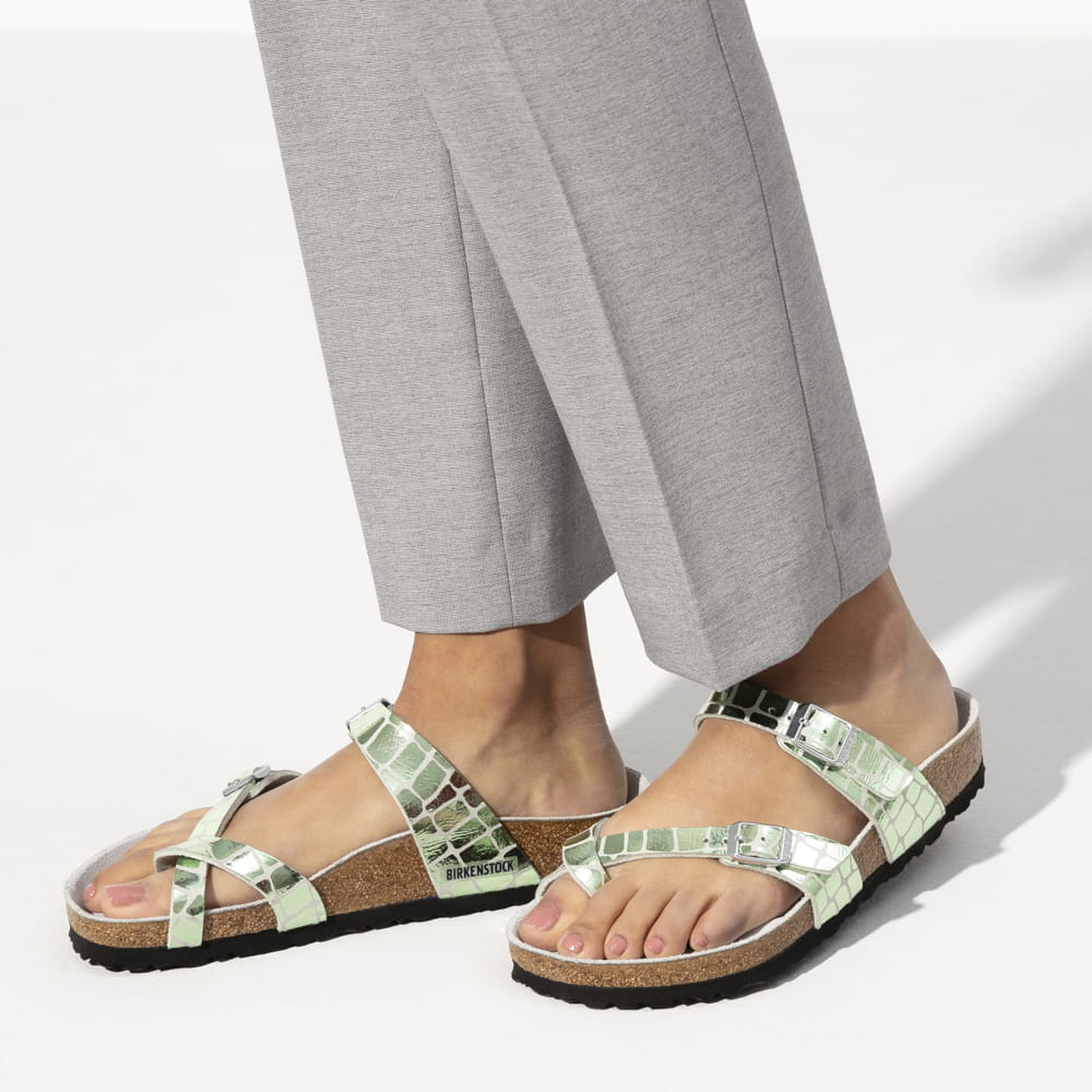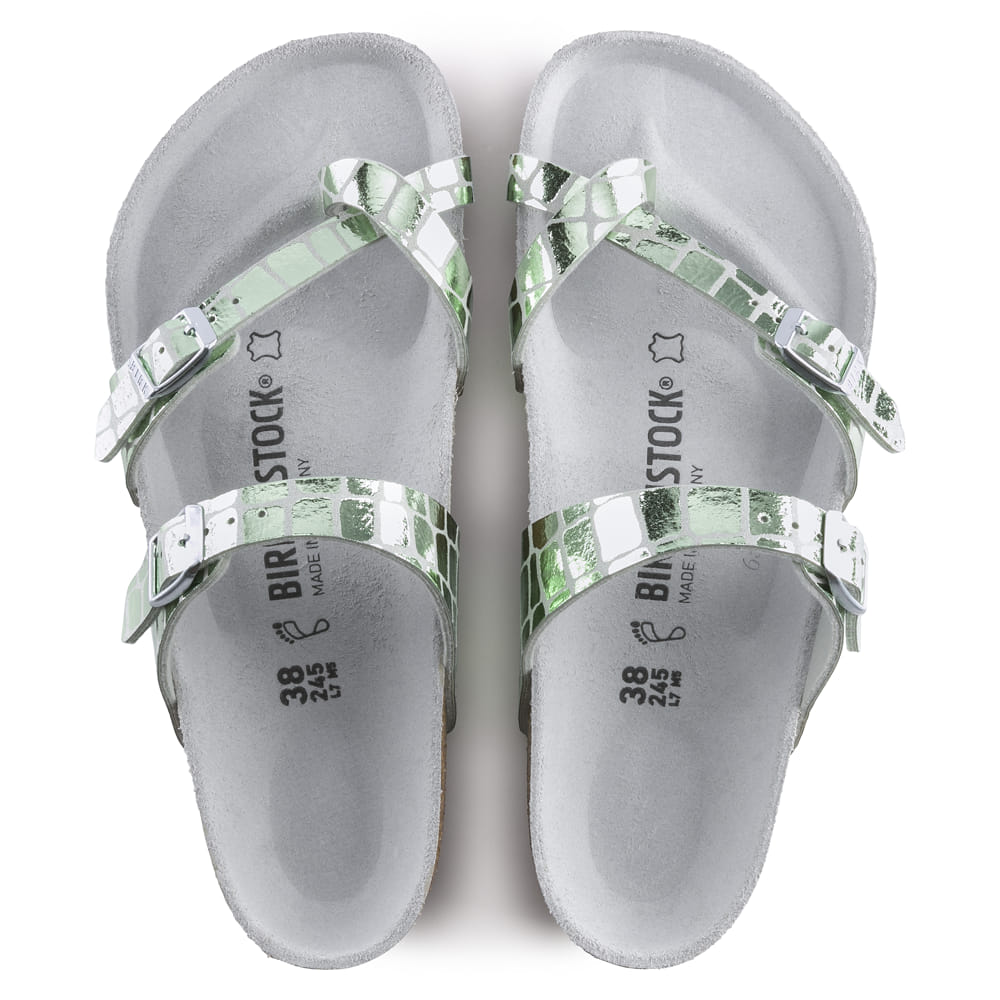 Jaunty and modern! The BIRKENSTOCK Mayari thong sandal stands out with its flowing look and brings together design and comfort. This version sports an alligator pattern and an eye-catching microfiber material made with a matte base combined with a shiny-effect film. Inspired by nature, no two shoes have the same look and feel. The color-coordinated footbed and the buckles round off the shoe's look of sophistication.