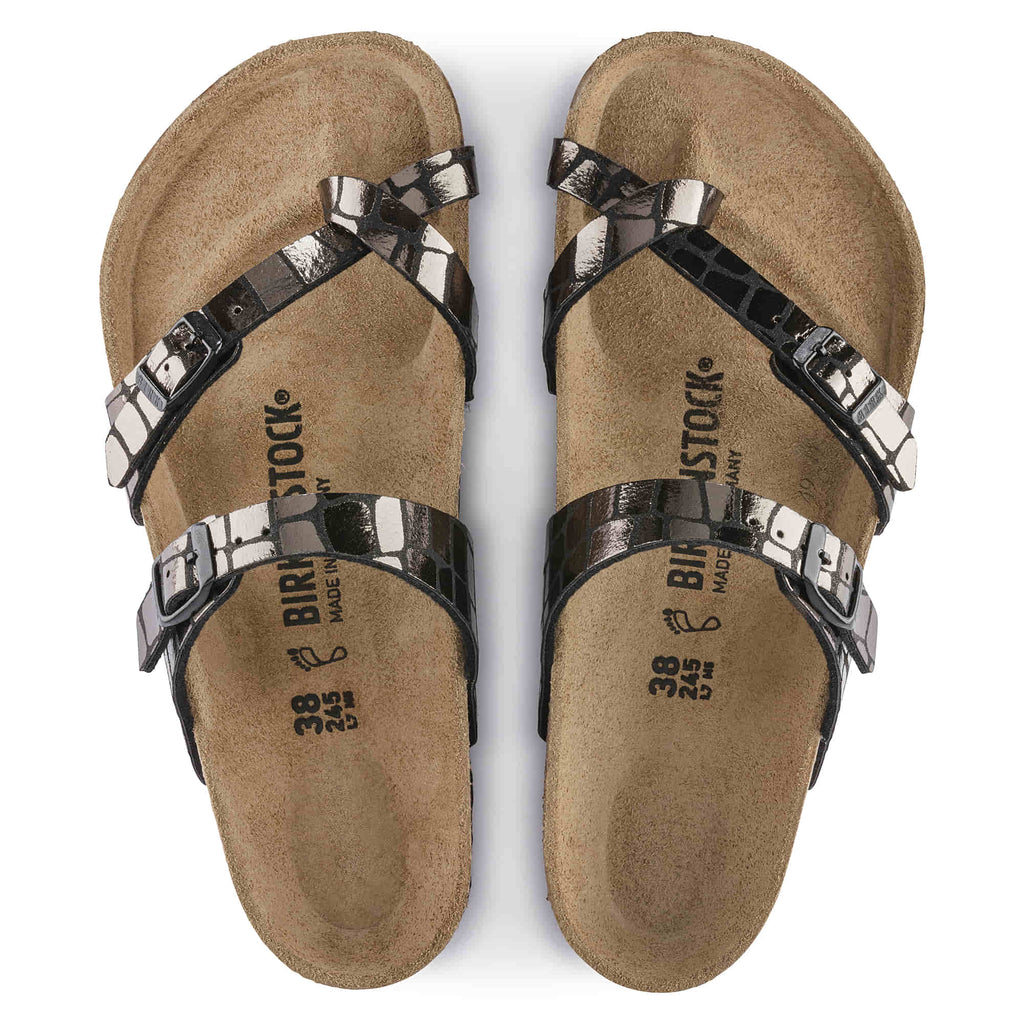 Jaunty and modern! The BIRKENSTOCK Mayari thong sandal stands out with its flowing look and brings together design and comfort. This version sports an alligator pattern and an eye-catching microfiber material made with a matte base combined with a shiny-effect film. Inspired by nature, no two shoes have the same look and feel. Anatomically shaped cork-latex footbed