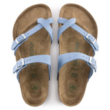 Jaunty and modern! The BIRKENSTOCK Mayari thong sandal stands out with its flowing look and brings together design and comfort. This popular sandal has been given an update in a new material, with a vegan version now available. It is entirely free of animal products, as verified by independent testing laboratories. The color-coordinated outsole rounds off the shoe's look of sophistication. The upper is made from the skin-friendly, hard-wearing synthetic material Birko-Flor®.