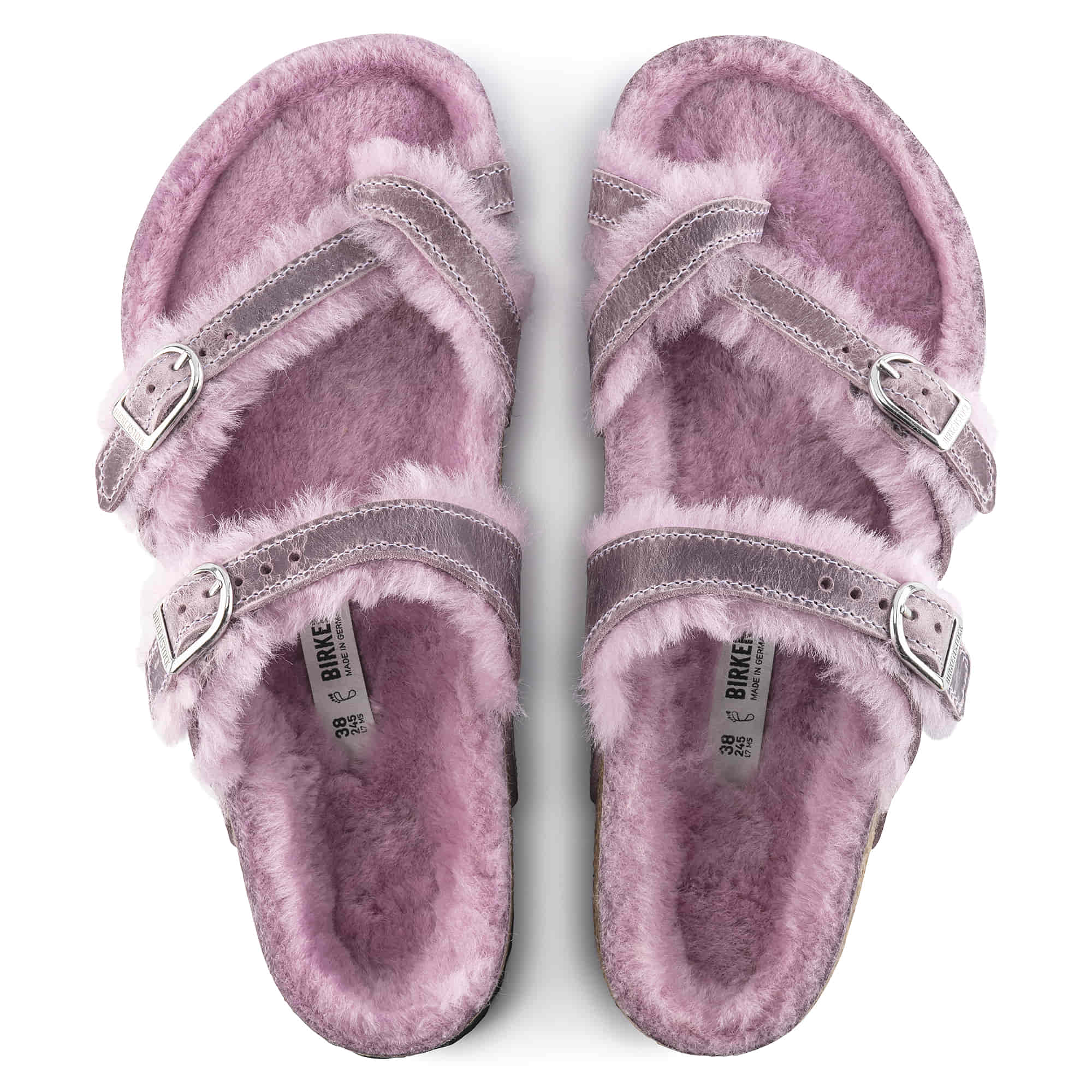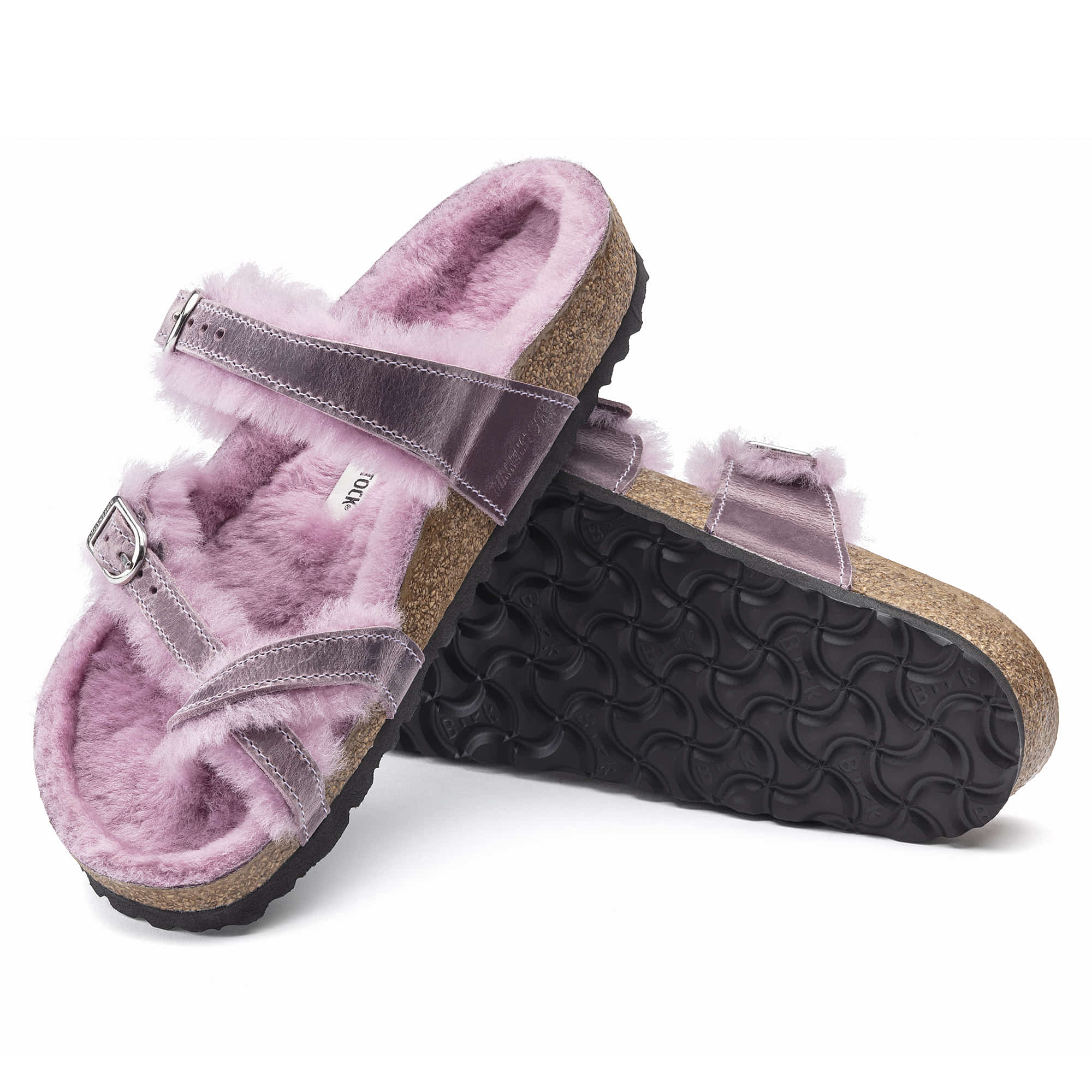Jaunty and modern! The BIRKENSTOCK Mayari thong sandal stands out with its flowing look and brings together design and comfort. Here, the classic model comes in a particularly cozy version with shearling lining and straps lined with shearling. The perfect shoe for cozy winter evenings by an open fire! The buckles in the form of horseshoes are are a real eye-catcher. The upper is made from extra thick, oiled nubuck leather with an open-selvage finish.