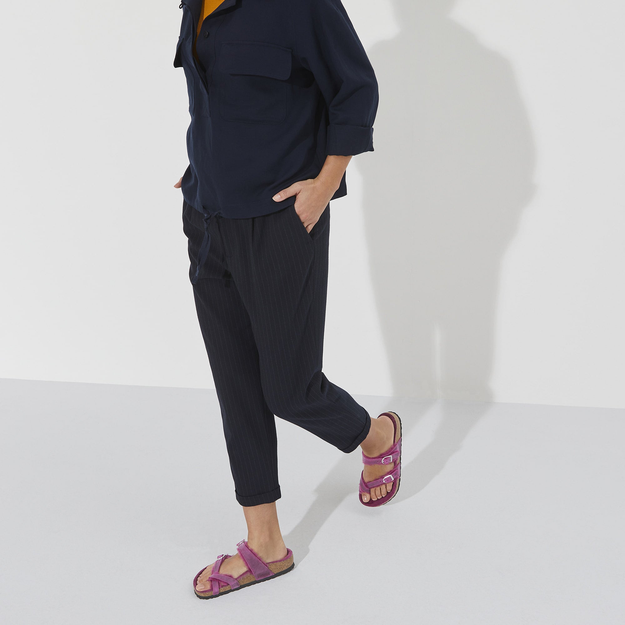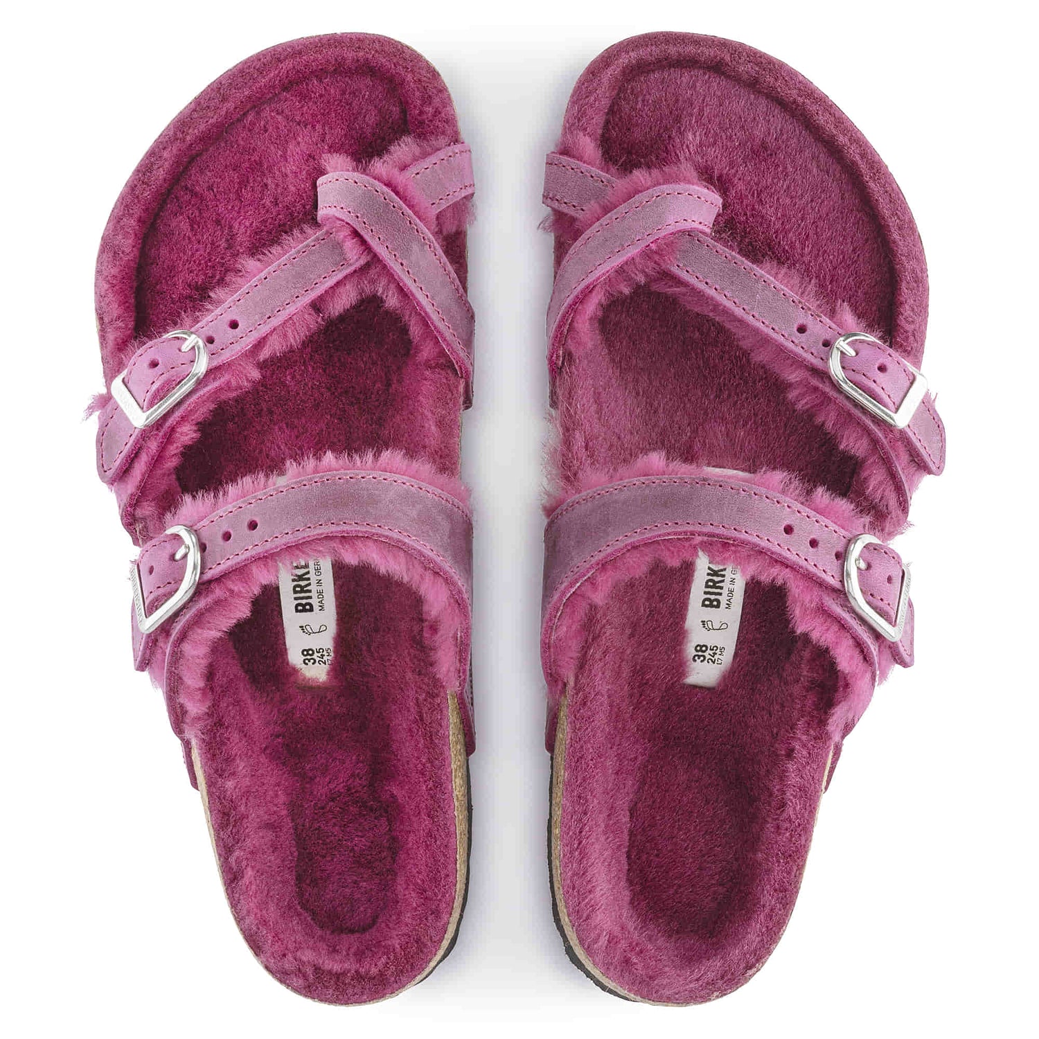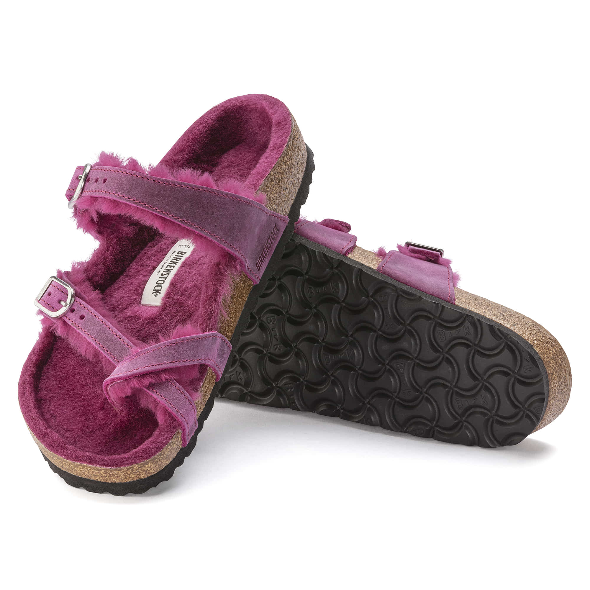Jaunty and modern! The BIRKENSTOCK Mayari thong sandal stands out with its flowing look and brings together design and comfort. Here, the classic model comes in a particularly cozy version with shearling lining and straps lined with shearling. The perfect shoe for cozy winter evenings by an open fire! The buckles in the form of horseshoes are a real eye-catcher. The upper is made from extra thick, oiled nubuck leather with an open-selvage finish.