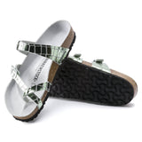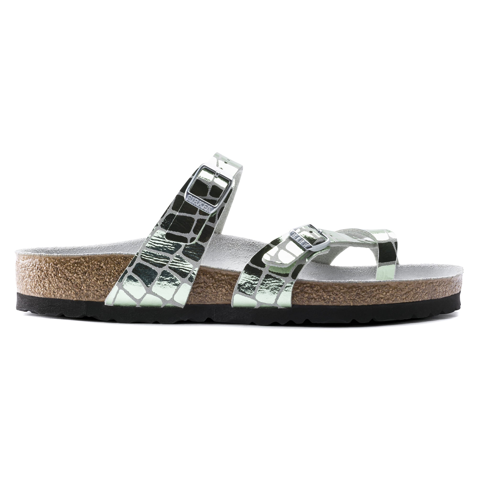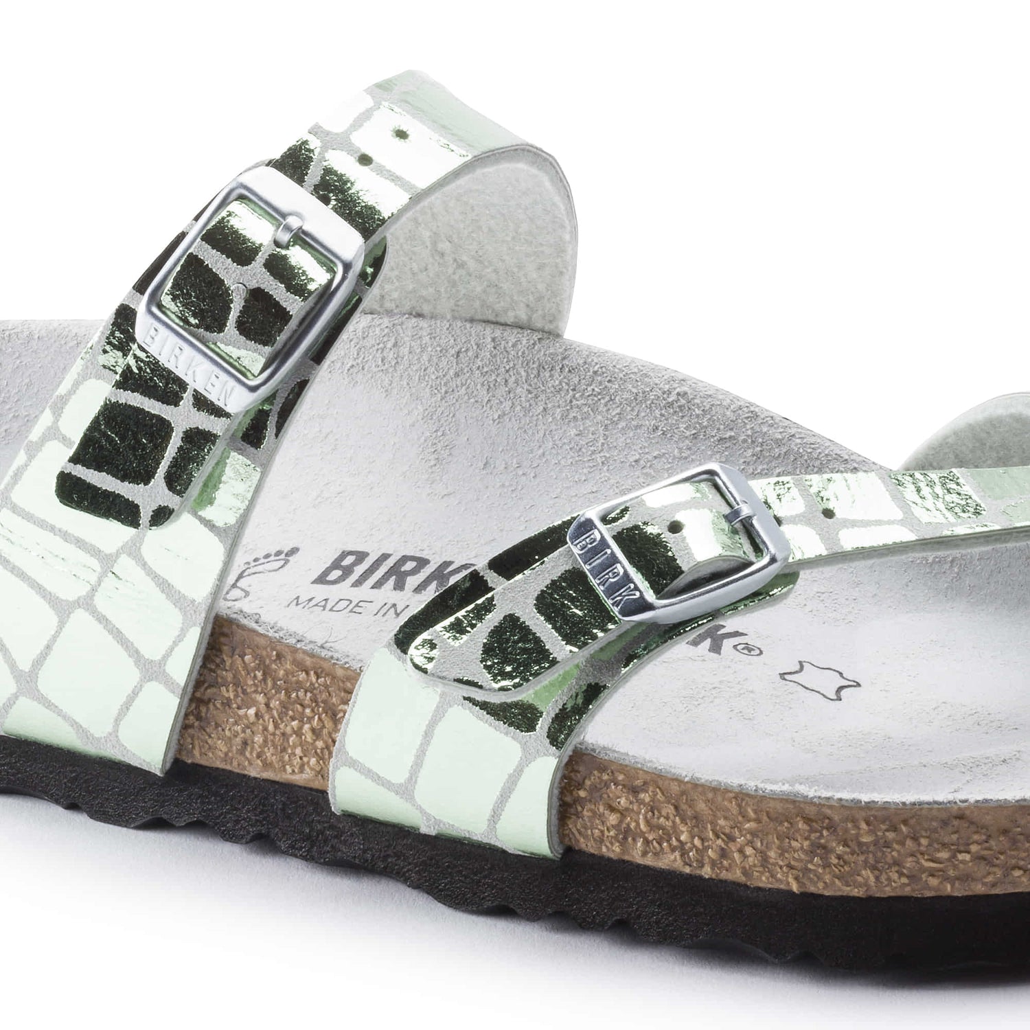 Jaunty and modern! The BIRKENSTOCK Mayari thong sandal stands out with its flowing look and brings together design and comfort. This version sports an alligator pattern and an eye-catching microfiber material made with a matte base combined with a shiny-effect film. Inspired by nature, no two shoes have the same look and feel. The color-coordinated footbed and the buckles round off the shoe's look of sophistication.