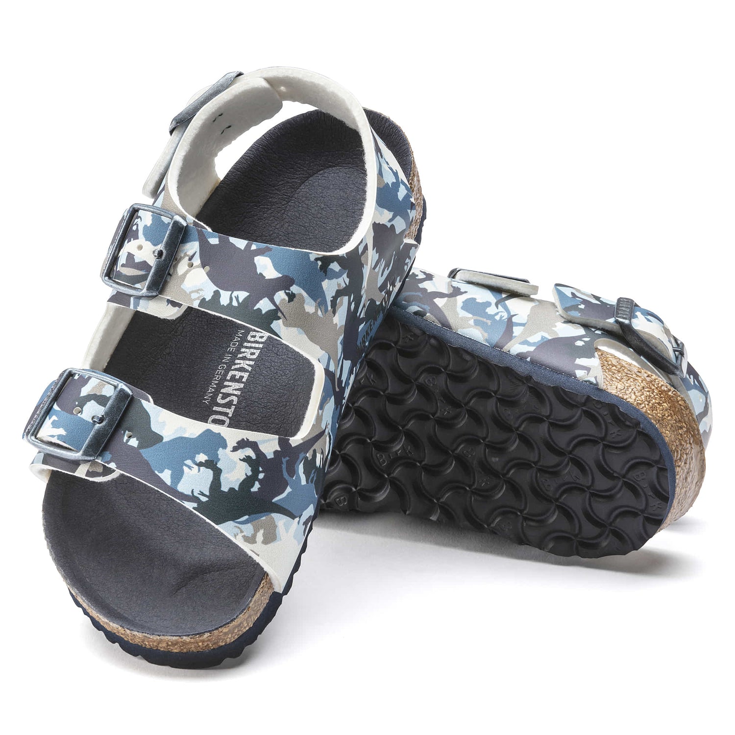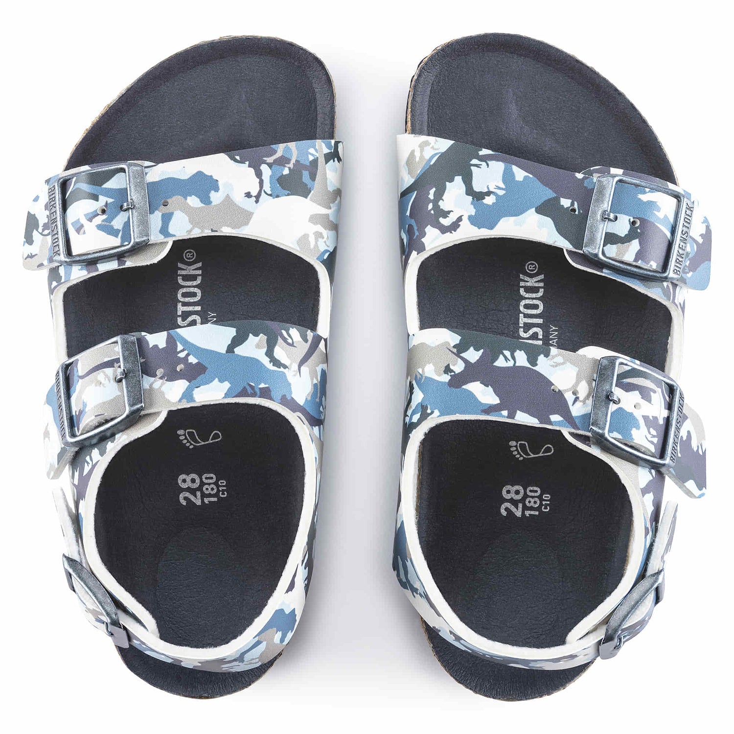 Maximum grip, stability, and a perfect fit! The BIRKENSTOCK Milano offers all of this thanks to its compact design with a heel strap also during boisterous play. This version of the sandal will set boys hearts racing. The colorful dinosaur print will put a smile on kids faces all day long. The color-coordinated footbed rounds off the shoe's look of sophistication. The upper is made from the skin-friendly, hard-wearing synthetic material Birko-Flor®.