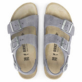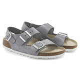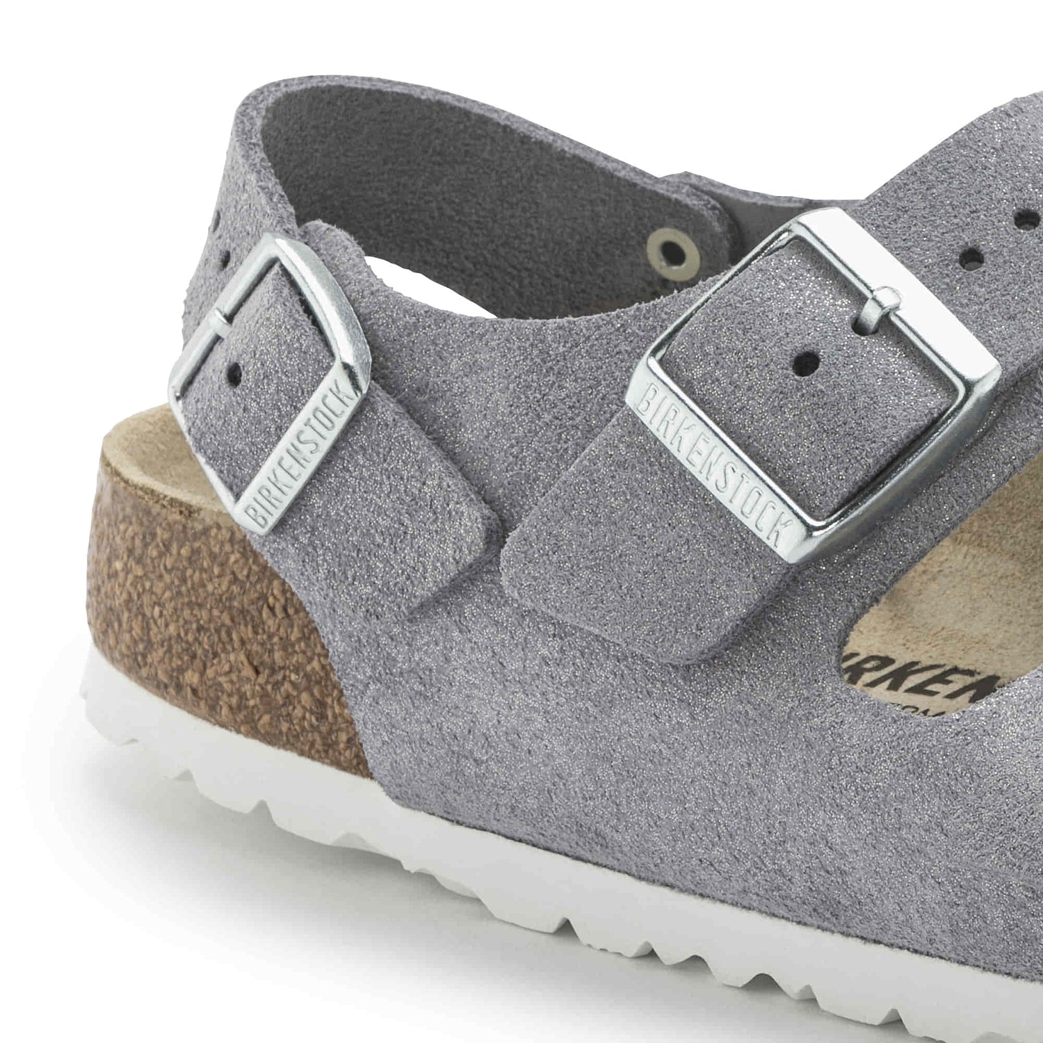 The BIRKENSTOCK Milano guarantees maximum grip and gives the feet stability during all activities. This is thanks to the slightly more compact upper with two straps and the wide ankle strap. This version boasts a subtle glitter finish which makes the shoes shimmer in the light. The upper is made from especially soft suede which hugs the foot like a second skin.