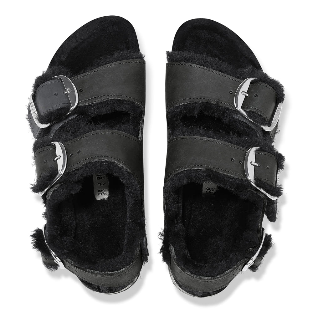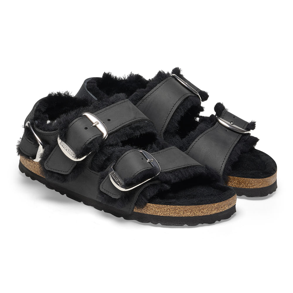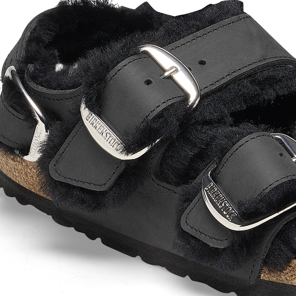 Maximum grip, stability, and a perfect fit! The BIRKENSTOCK Milano offers all of this thanks to its compact design with an ankle strap. This model comes in a particularly cozy version with shearling lining and straps lined with shearling as well as a big, elegant pin buckle. A great, striking eye-catcher! The upper is made from extra thick, oiled nubuck leather with an open-selvage finish.