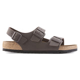 Maximum grip, stability, and a perfect fit! The BIRKENSTOCK Milano offers all of this thanks to its compact design with an ankle strap. The upper is made from the skin-friendly, hard-wearing synthetic material Birko-Flor®. Here, the sophisticated material use gives the classic model a new look, which could almost be mistaken for real leather. The color-coordinated buckles with a textile feel and a matte design as well as the color-contrasting outsole are additional eye-catchers. With its additional foam layer, the soft footbed offers extra comfort and pampers feet all day long.